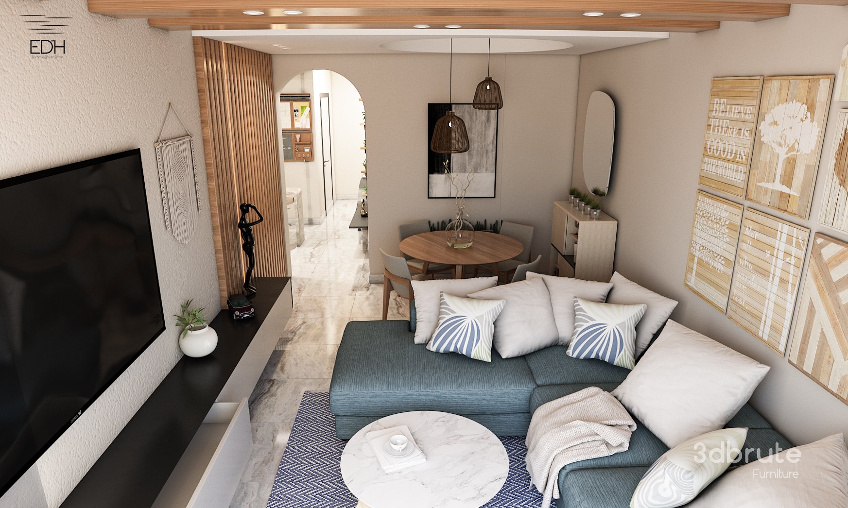 3D Scene of a cozy tiny Reception with dining table , Kitchen, and Entrance Lobby |