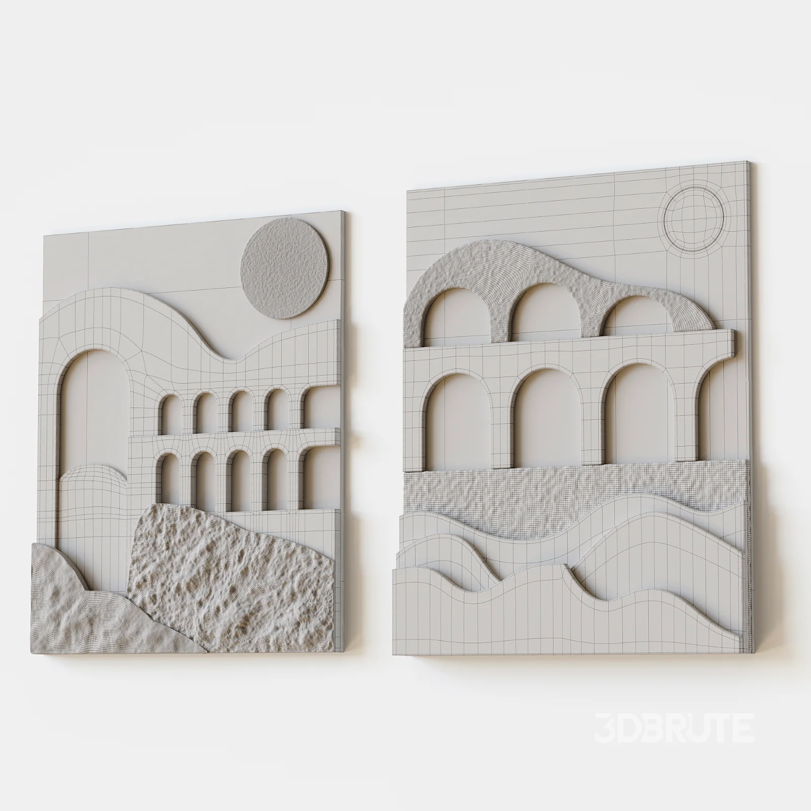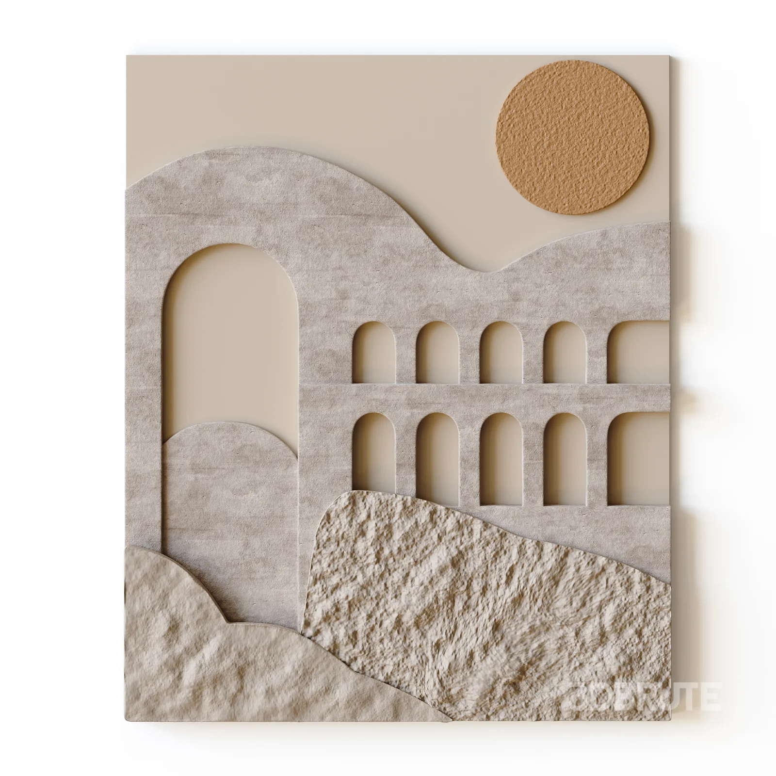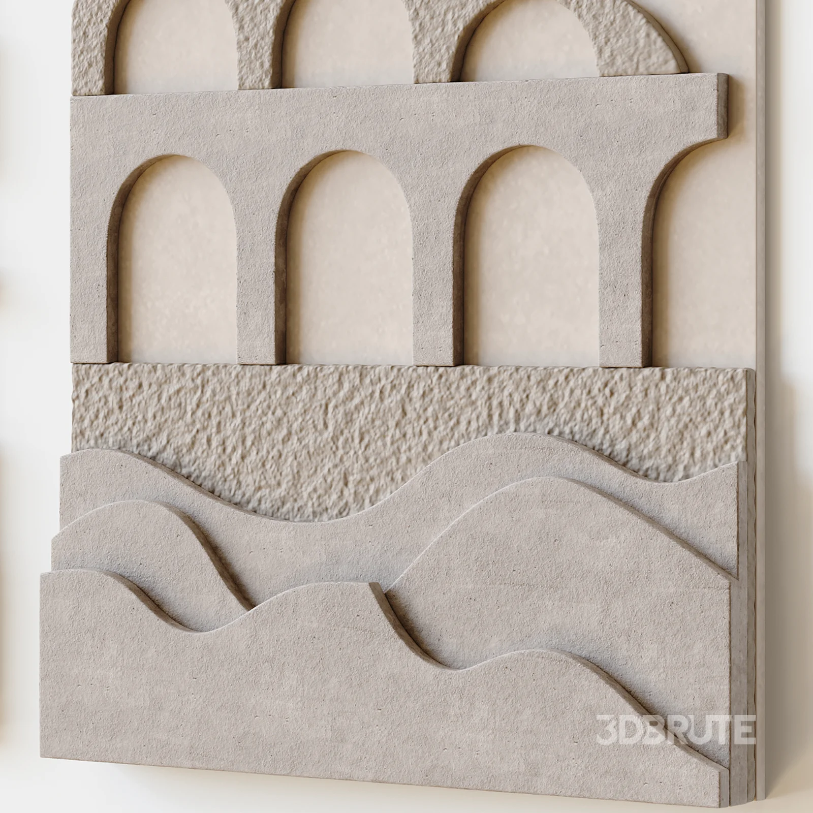 High quality 3D Wall Mural model with abstract architectural relief design. The model features layered geometric shapes, arches, and textured surfaces inspired by modern architectural wall art. Suitable for interior visualization, wall decoration, architectural renders, and modern interior design projects. Clean geometry, real-world scale, and professional topology make the model ready for production use. Fully compatible with Corona Renderer and V-Ray, ideal for use in living rooms, offices, hotels, galleries, and premium decorative wall concepts.