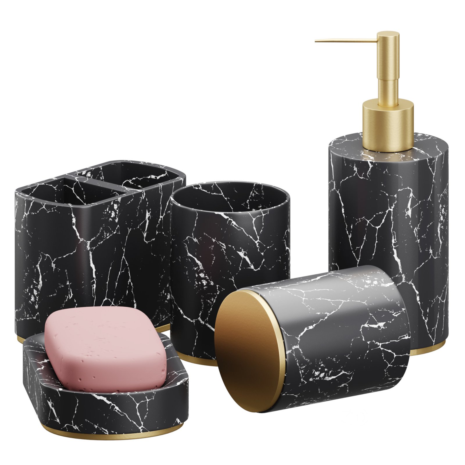 Name: 5 Piece Bathroom Counter Top Accessory Set Tags: bathroom set, bathroom accessories, countertop set, soap dispenser, toothbrush holder, modern bathroom, bathroom decor, bath organizer, soap dish, tumbler, bathroom storage, elegant accessories, contemporary design, home accessories, bathroom essentials, interior design, hygiene set, resin accessory set, 3D model, bathroom collection |