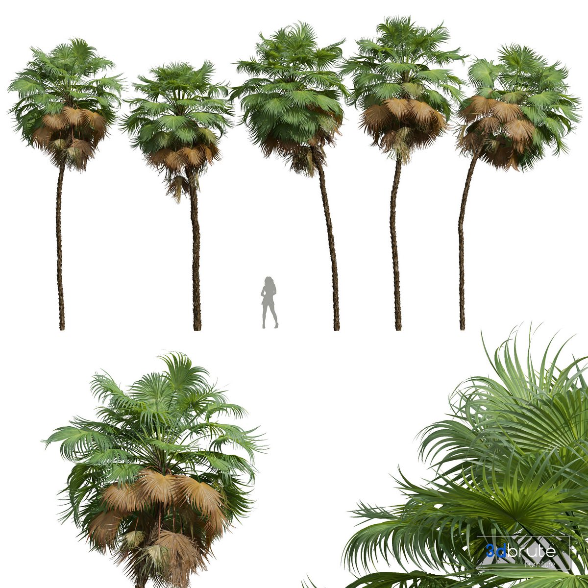 Description: Acoelorrhaphe is a genus of palms with single species Acoelorrhaphe wrightii, known as the Paurotis palm, Everglades palm or Madeira palm in English and cubas, tique, and papta in Spanish. It is native to Central America, southeastern Mexico, the Caribbean, Colombia, the Bahamas, and extreme southern Florida where it grows in swamps and periodically flooded forests. It is a small to moderately tall palm that grows in clusters to 5???7 meters (16???23 ft), rarely 9 m (30 ft) tall, with slender stems less than 15 centimetres (5.9 in) diameter. The leaves are palmate (fan-shaped), with segments joined to each other for about half of their length, and are 1???2 m (3.3???6.6 ft) wide, light-green above, and silver underneath. The leaf petiole is 1???1.2 m (3.3???3.9 ft) long, and has orange, curved, sharp teeth along the edges. The flowers are minute, inconspicuous and greenish, with 6 stamens. The trunk is covered with fibrous matting. The fruit is pea-sized, starting orange and turning to black at maturity. 5 Different 3D models in the scene Height: 11000mm & 10000mm & 11500mm & 12000mm & 10000mm Big Preview: 1- Materials is archive (material library) Note: - To use the max file you need to use at 3dsmax 2015 If you have any problems for setting up the models, |