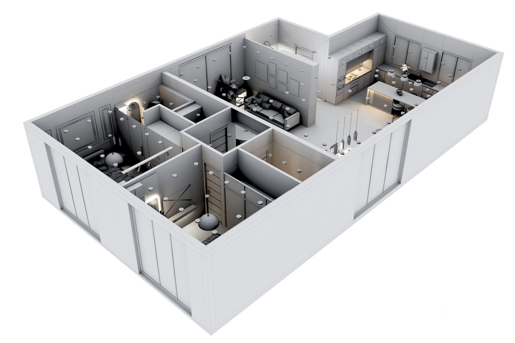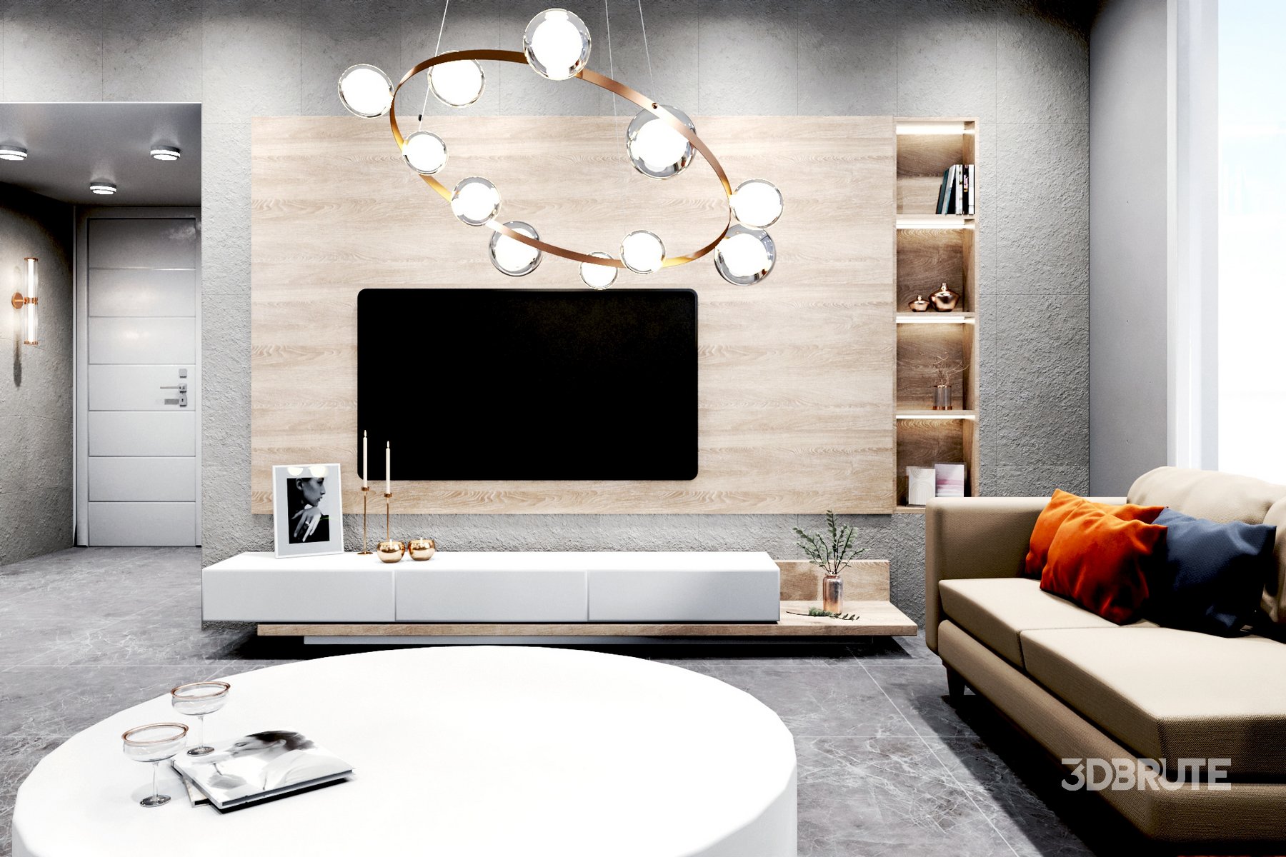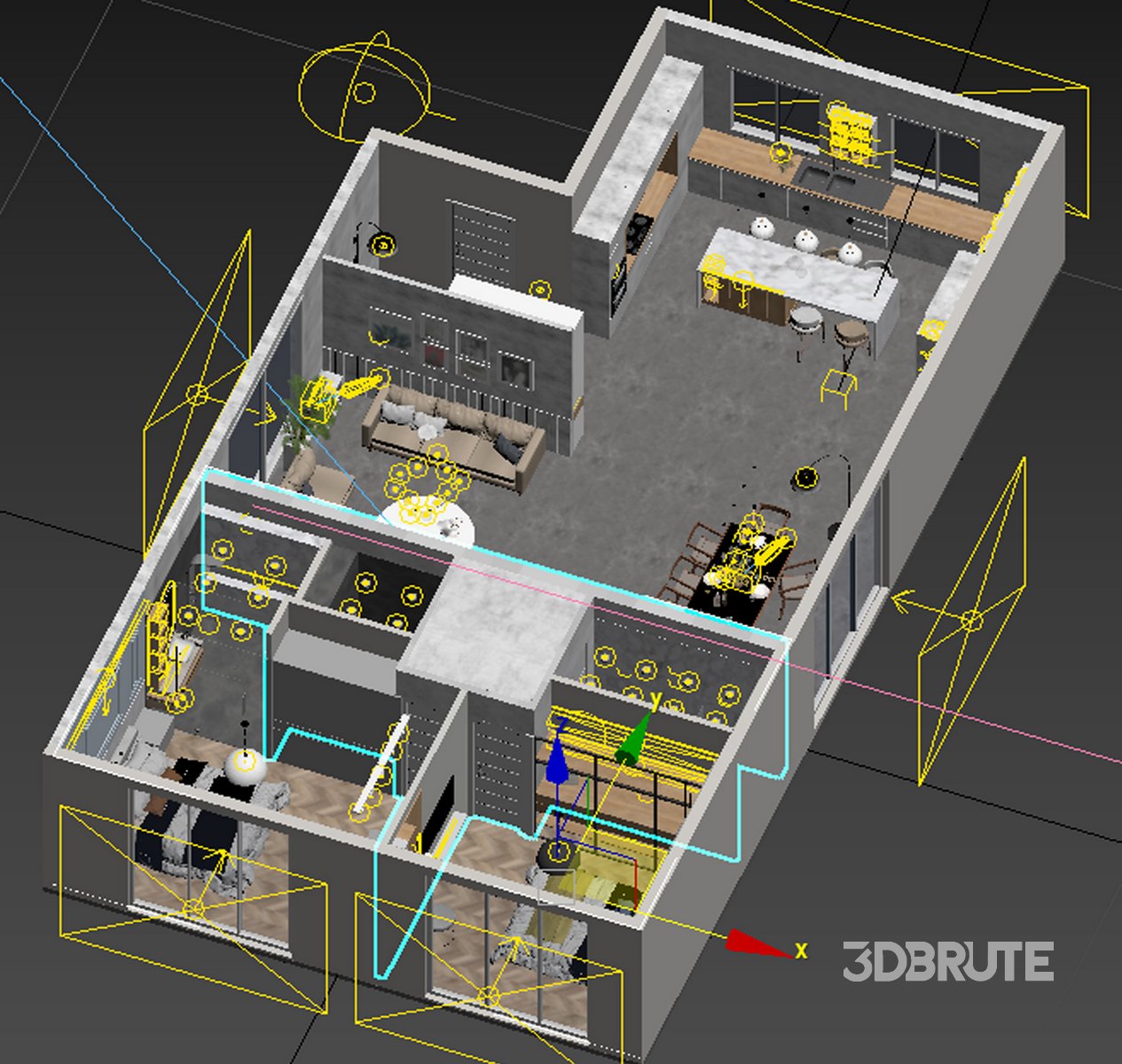 Apartment Interior Design 3D model - livingroom: Sofas, tv wall, Dining set, Wine Rack, floor light, ceiling lights, wall light, interior Plants, Decorative Set... The interior scene contains materials, light setup and cameras, The native file is 3dsmax-Vray but the file is converted to corona renderer too for corona users. It is ready to render with Vray + Corona renderer. The scene contains Max file, FBX file and OBJ Apartment Interior Design |