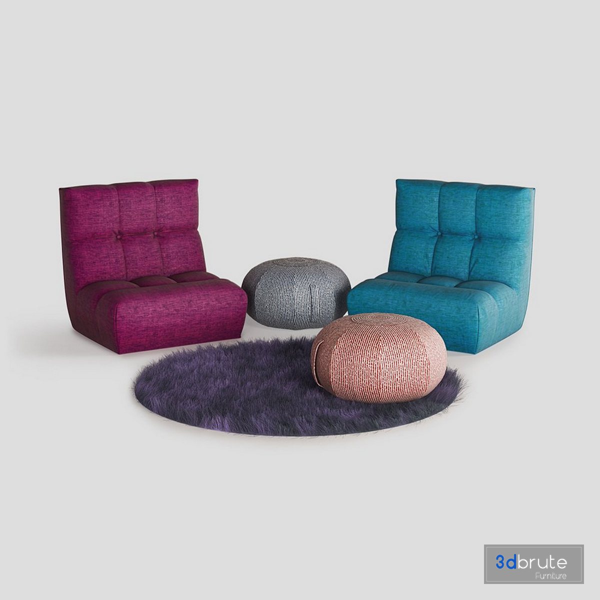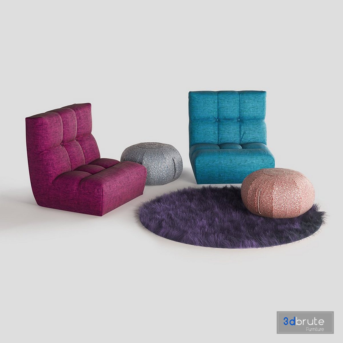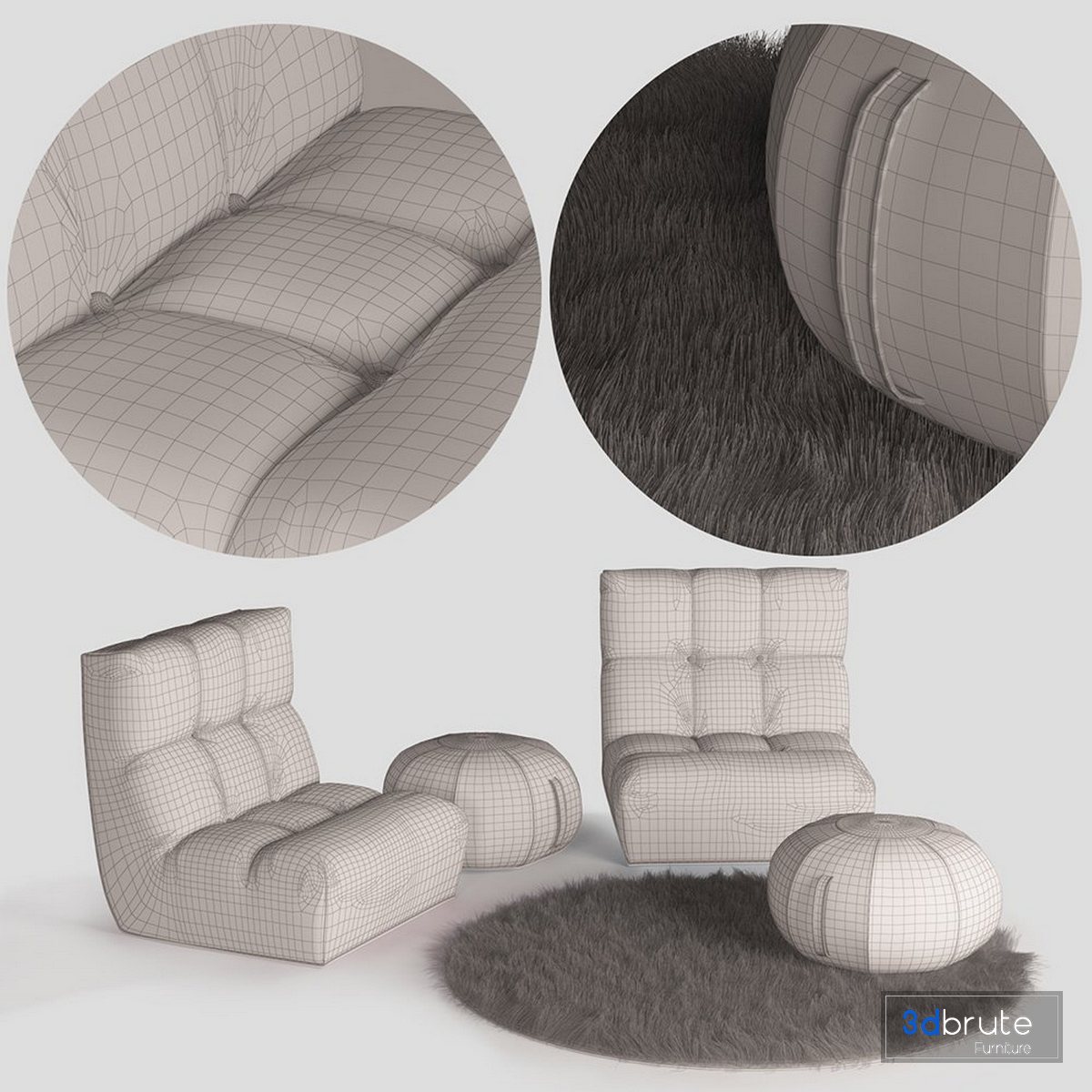 - Armchair and Ottoman Pouf The rug is made with Hair and Fur. The poufs have Unwrap UVW and some models have V-ray Displacement. If you need a different format please comment for me. Formats: (3dsMax 2014+Vray 3.2) + (Fbx+Vray) + (Obj) Unit: cm Polygons with Turbo smooth off: 37,488 Polygons with Turbo smooth on: 299,872 Vertexes With Turbo smooth off: 38,222 Vertexes With Turbo smooth on: 151,358 The textures resolution: 1500 *1500 to 2500 * 2500 |