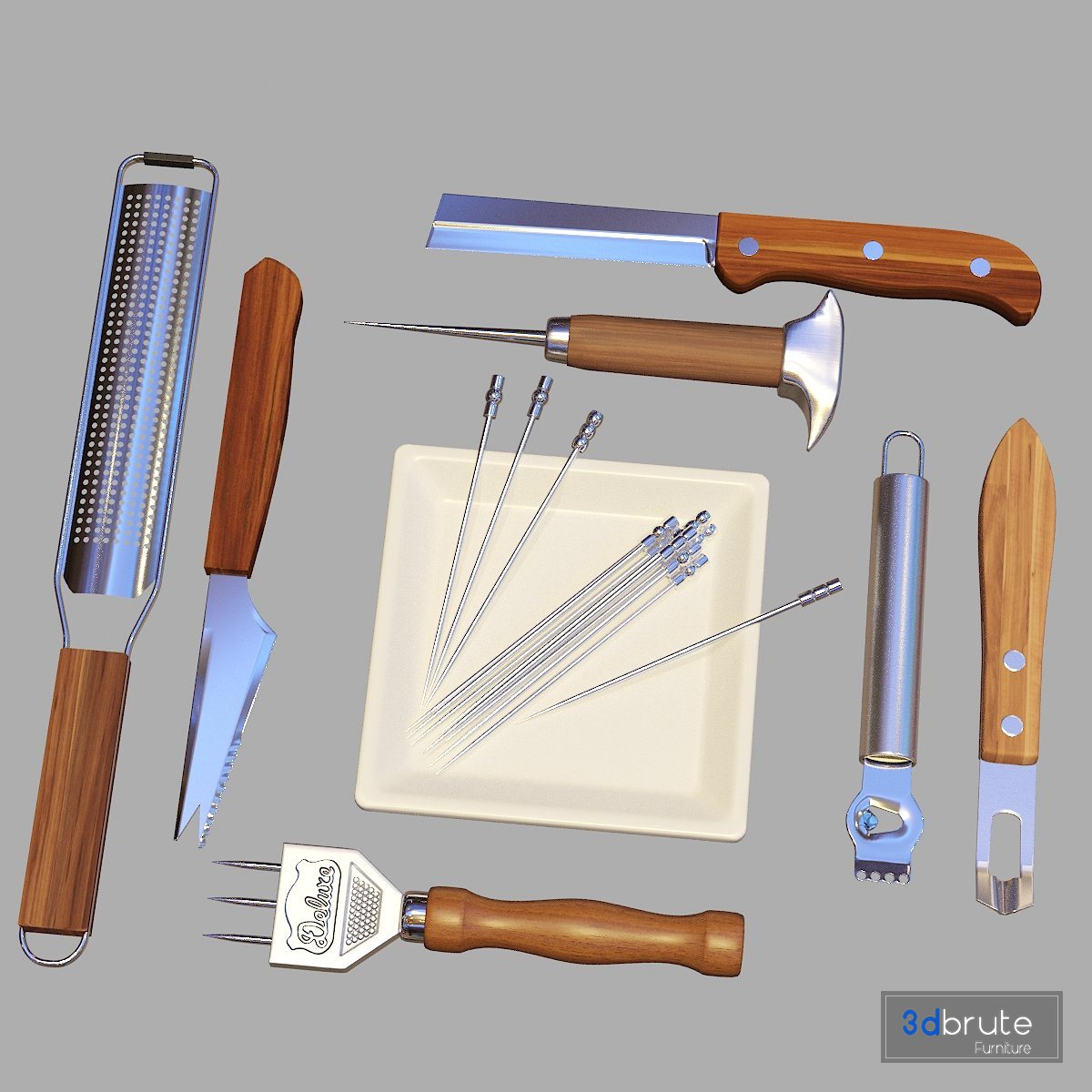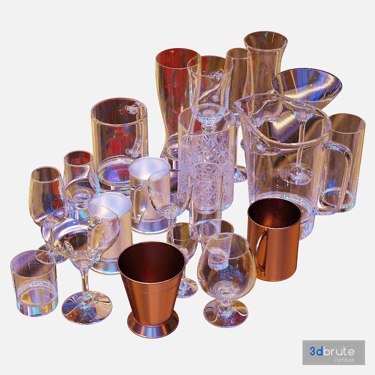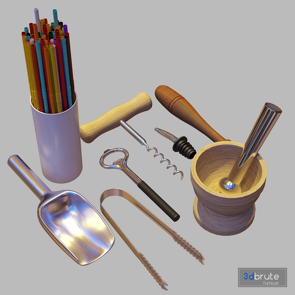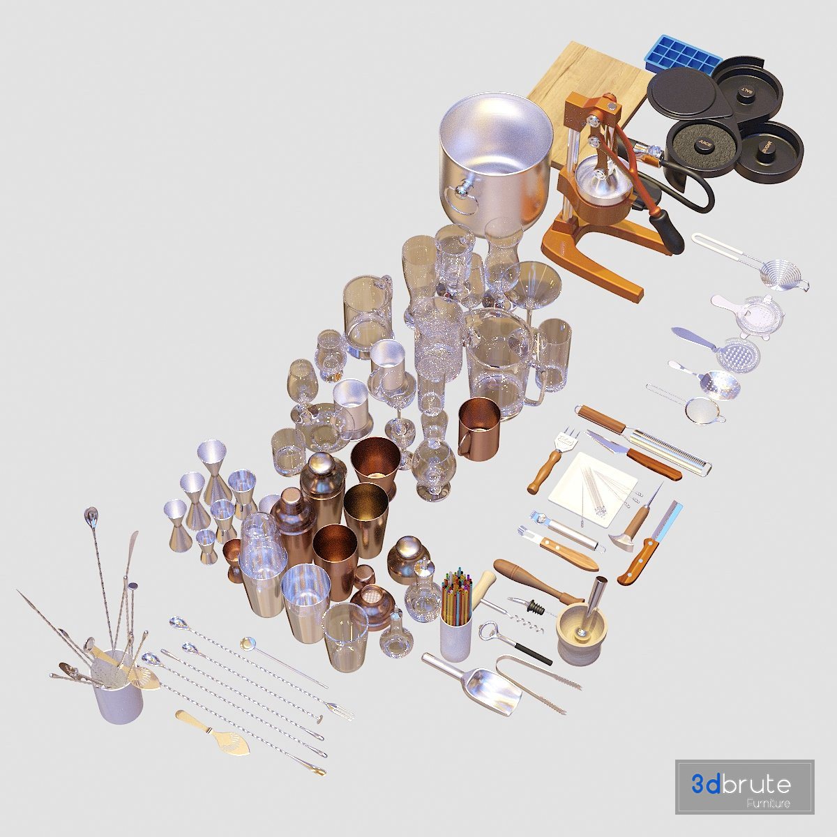 Bartender Tools Set includes 70 objects what can be used in scenes with following subjects: bar, pub, party, club, kitchen, interior design, ...