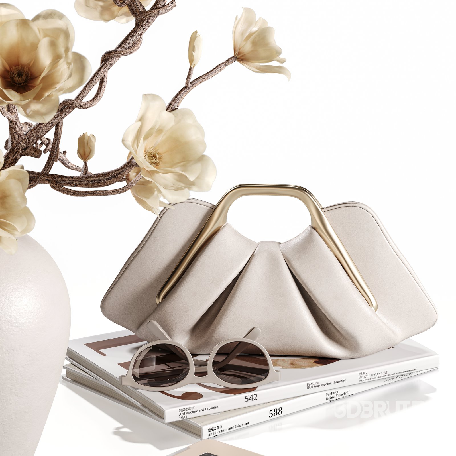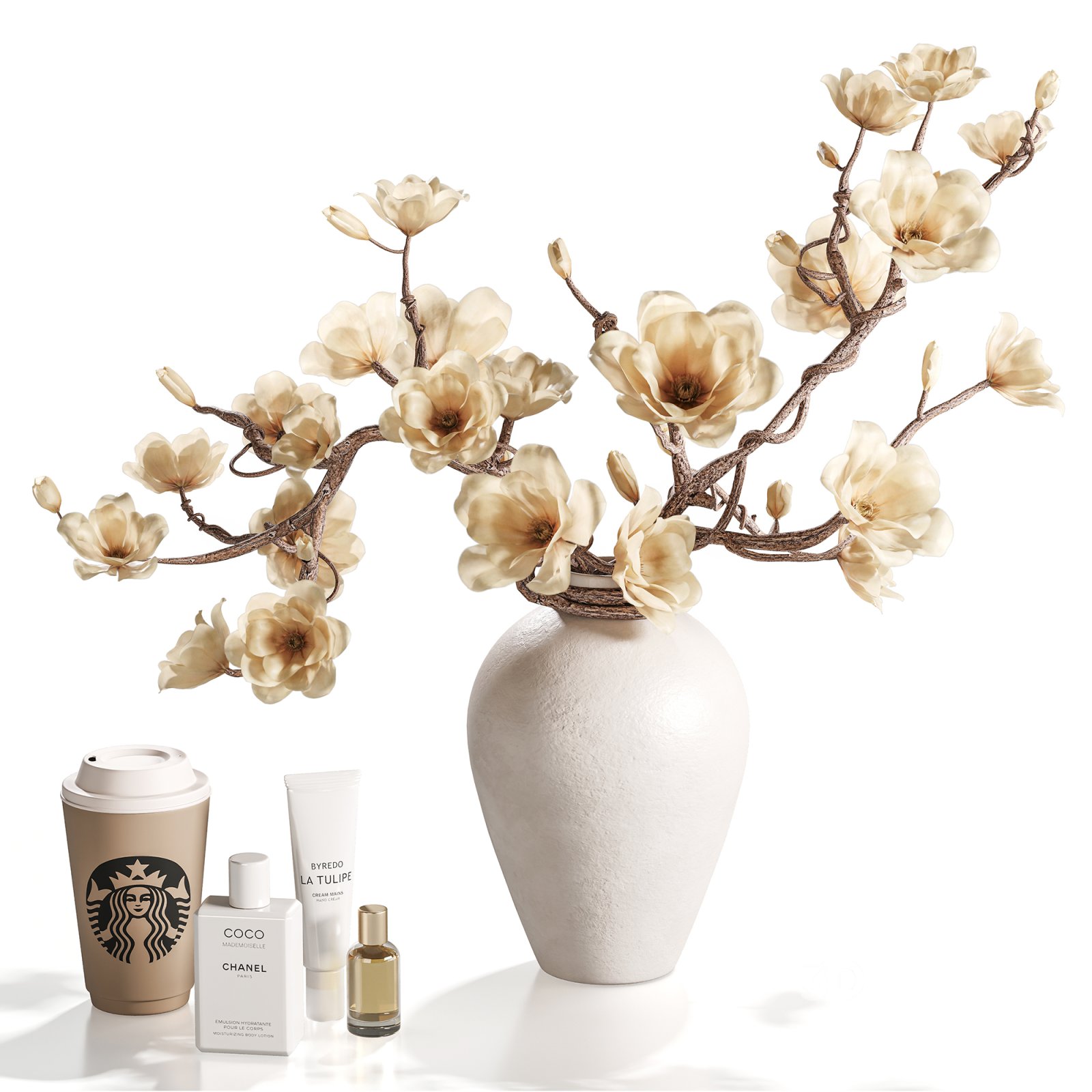 High-quality 3D decorative still life featuring magnolia branches in a textured ceramic vase, surrounded by a curated selection of neutral-toned lifestyle items. The scene includes designer accessories, books, and beauty products in soft beige and cream tones, creating an elegant, cohesive composition perfect for interior visualization, lifestyle renderings, or product mockups.