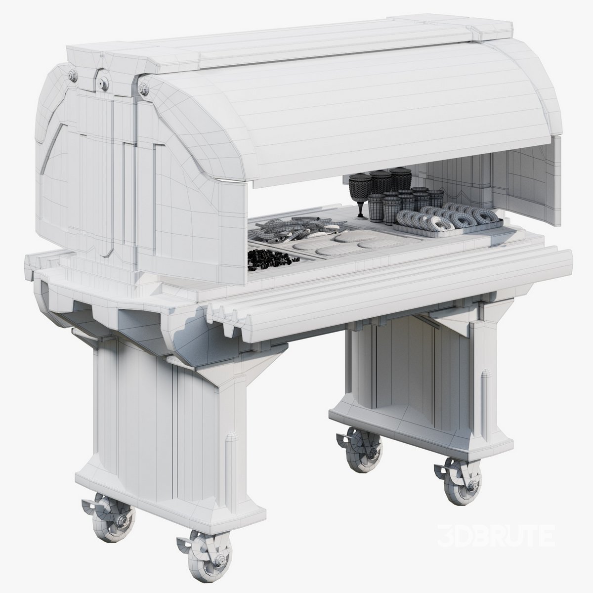 This detailed 3D model features the "Cambro Versa Food Service Table" fully set with a variety of food, drinks, and desserts. Perfect for use in hotel buffets, restaurants, or cafeterias, the table includes sections for hot and cold dishes, beverages, and an assortment of sweets. The model is highly realistic, with intricate textures for each food item, including salads, pastries, juices, and more. Ideal for interior design visualizations, hospitality scenes, or advertising campaigns. |
