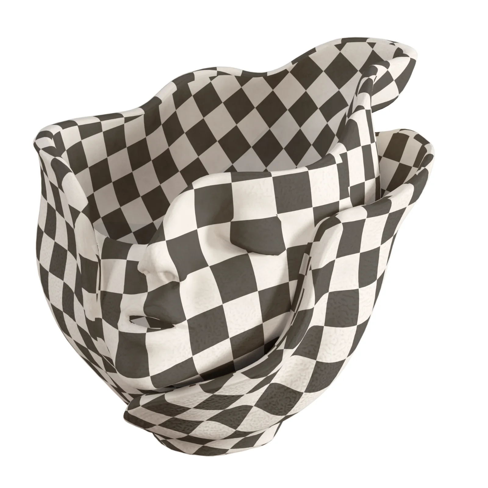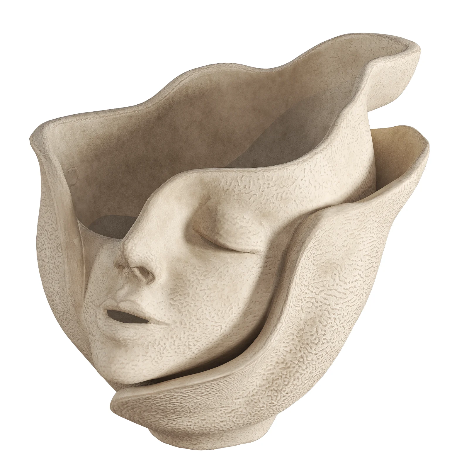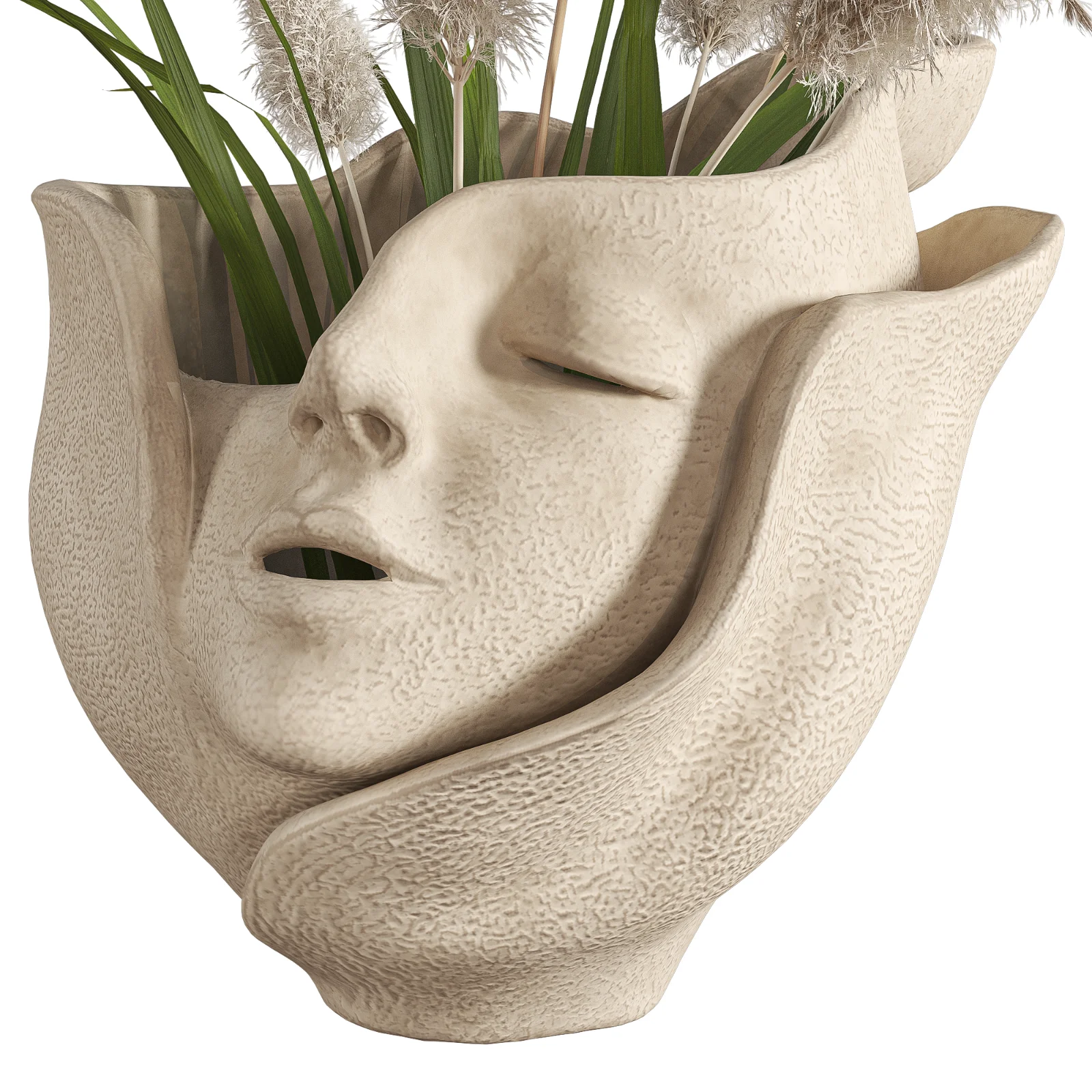 This high-quality 3D model features a unique, artistic sculptural vase designed in the shape of a serene, sleeping human face. The bust is artistically enveloped in stylized, organic petal-like folds, creating a surreal and modern aesthetic. The model is textured with a realistic matte beige ceramic or rough plaster finish, showcasing detailed surface imperfections that add depth and realism to close-up renders. The planter is arranged with a naturalistic bouquet of dry pampas grass plumes and slender green reeds, making it an ideal decorative element for Boho-chic, minimalist, and contemporary interior visualization projects. The topology is optimized for photorealistic rendering, capturing the interplay of light on the curved facial features and the fibrous texture of the dried plants. |