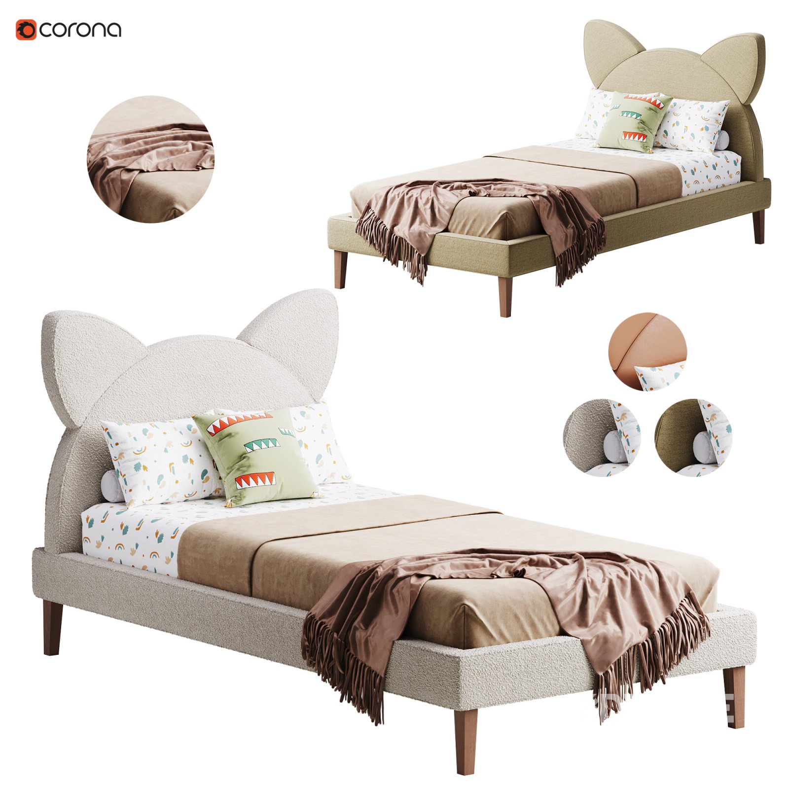 Name: Children single bed beige Kitty Description: The Children Single Bed Beige Kitty is a delightful and comfortable bed designed for children's rooms. The 3D model is highly detailed, ensuring that it captures every feature of this cozy and stylish furniture piece. With photorealistic rendering using Corona, this bed is ideal for children's room visualizations, offering high-quality results for your design projects. Tags: 3DModel, Bed, ChildrenBed, Furniture, BedroomDesign, KidsRoom, 3DVisualization, 3DsMax, CoronaRender, HighPoly, 3DModeling, HomeDecor, InteriorDesign, FurnitureDesign, FBX, OBJ, ChildRoom, ModernFurniture, HomeDesign, 3DArt |