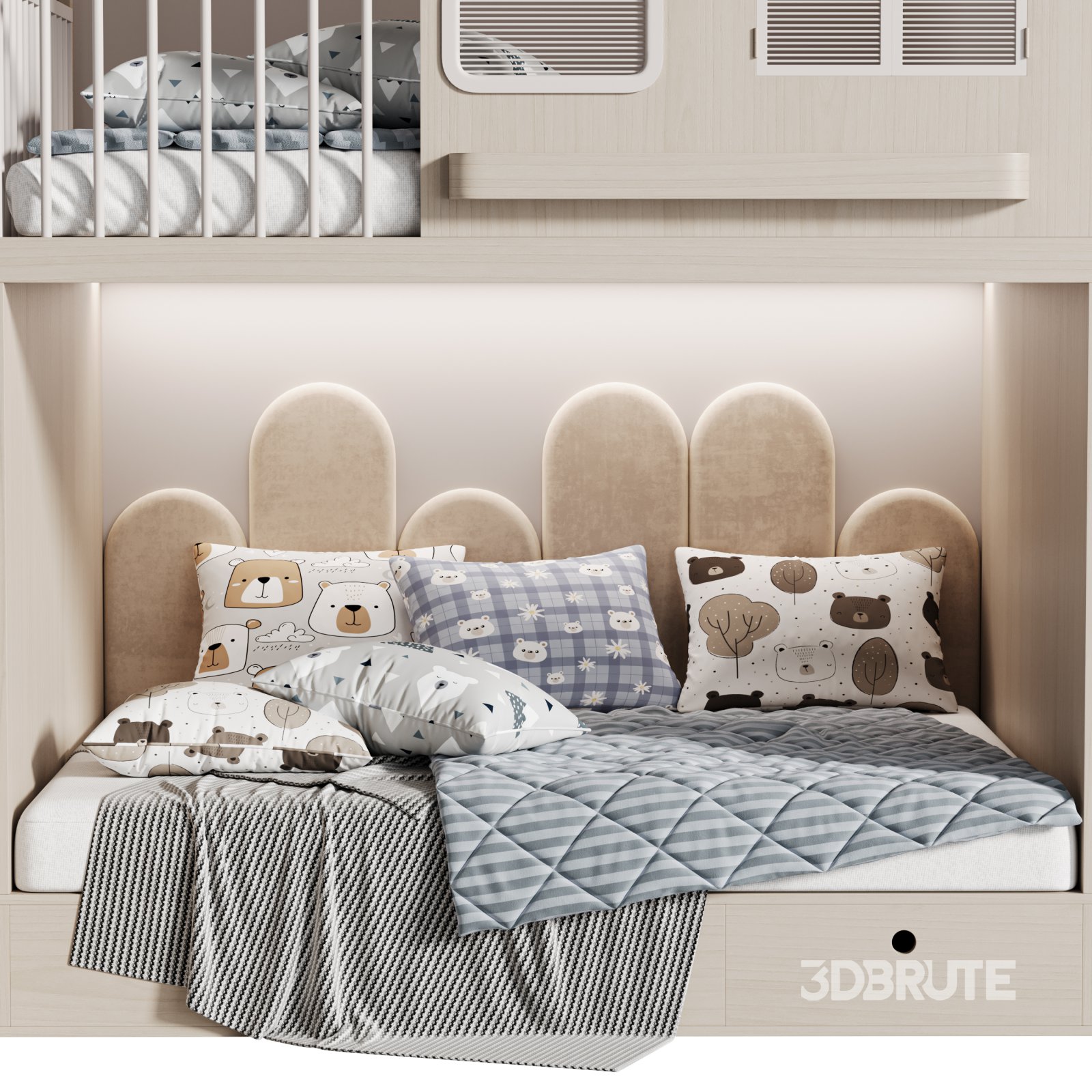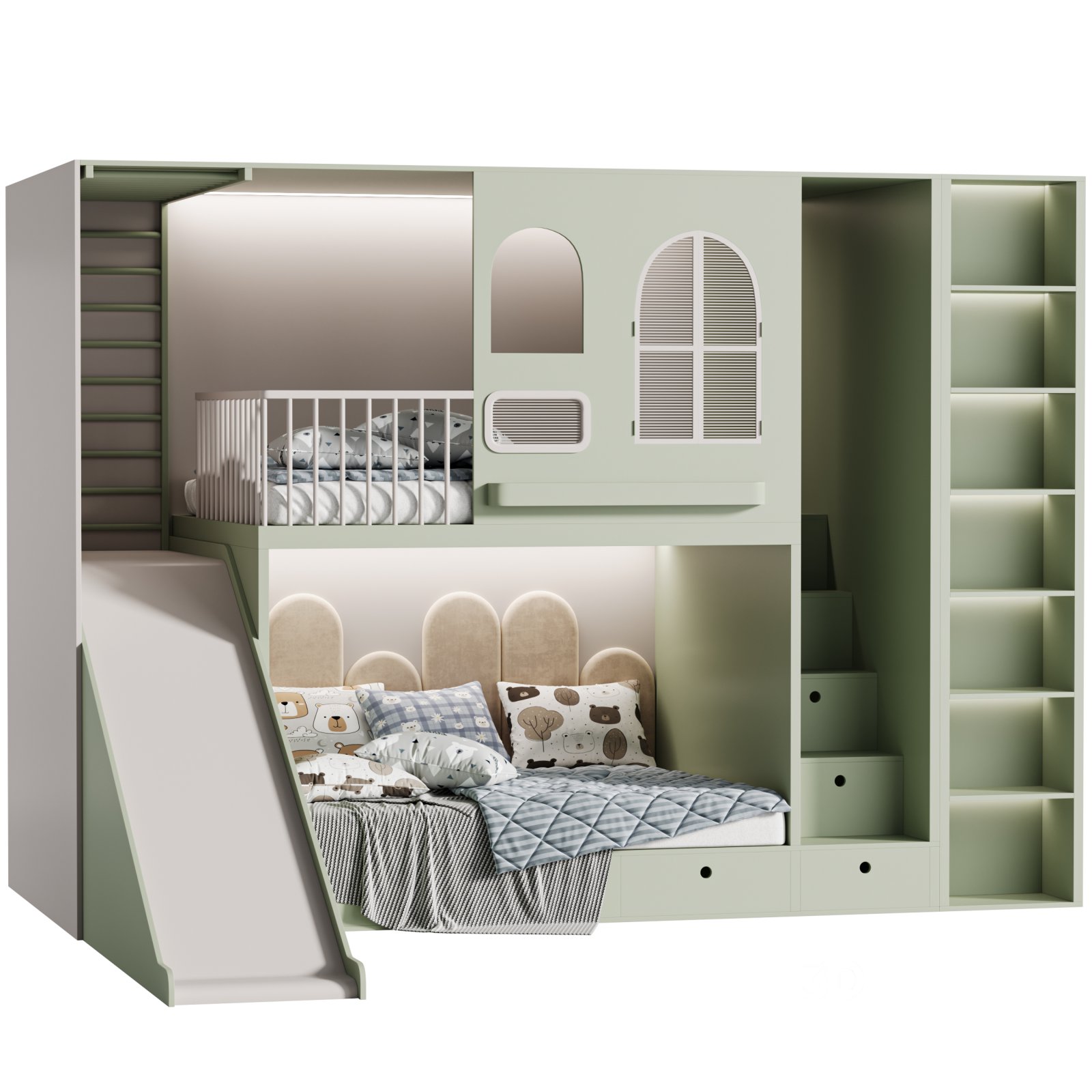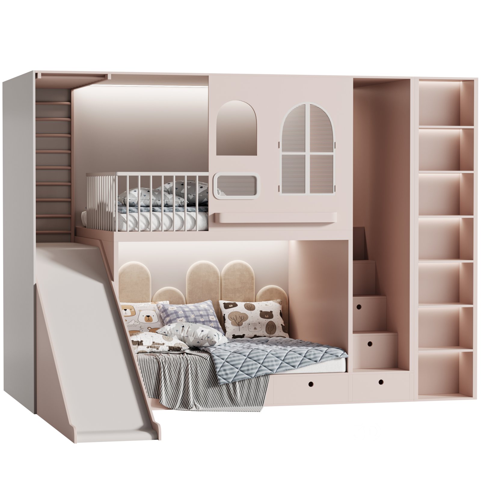 Description: Childrens bunk bed 34 is a multifunctional and playful furniture model designed specifically for kids' rooms. It features a two-level bed system with a slide, ladder, protective railings, decorative arched windows, and a cushioned lower sleeping area. The model includes integrated stairs with drawer storage and a full-height shelving unit, providing both sleeping and functional space. Designed in soft pastel color variants, it brings charm and practicality to any interior. Optimized for Corona Renderer, this high-poly model is ideal for use in interior design renders, kids’ room projects, and product showcases.