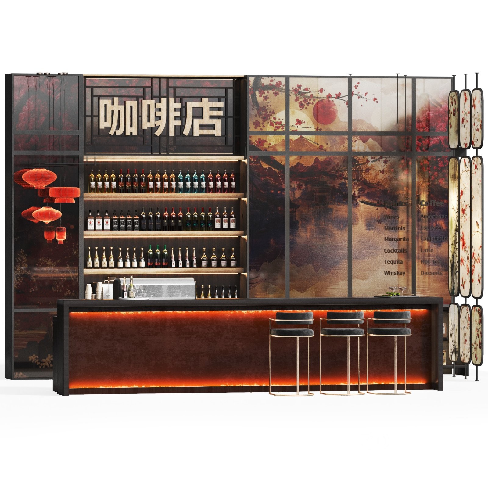 Chinese Cafe Restaurant design, with warm colors, lights and carefully crafted details to create an inviting and cozy atmosphere. Design elements can also be used across different seating areas and easily customized to enhance your space. use partition design in your area to seperat diffeent spaces and lanterns as ceiling lights. Includes a functional barista counter, suitable for coffee preparation and customer service. Workstation Cocktail By Frigomeccanica. |