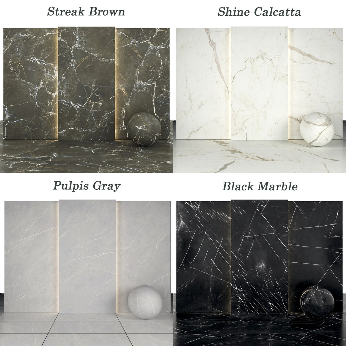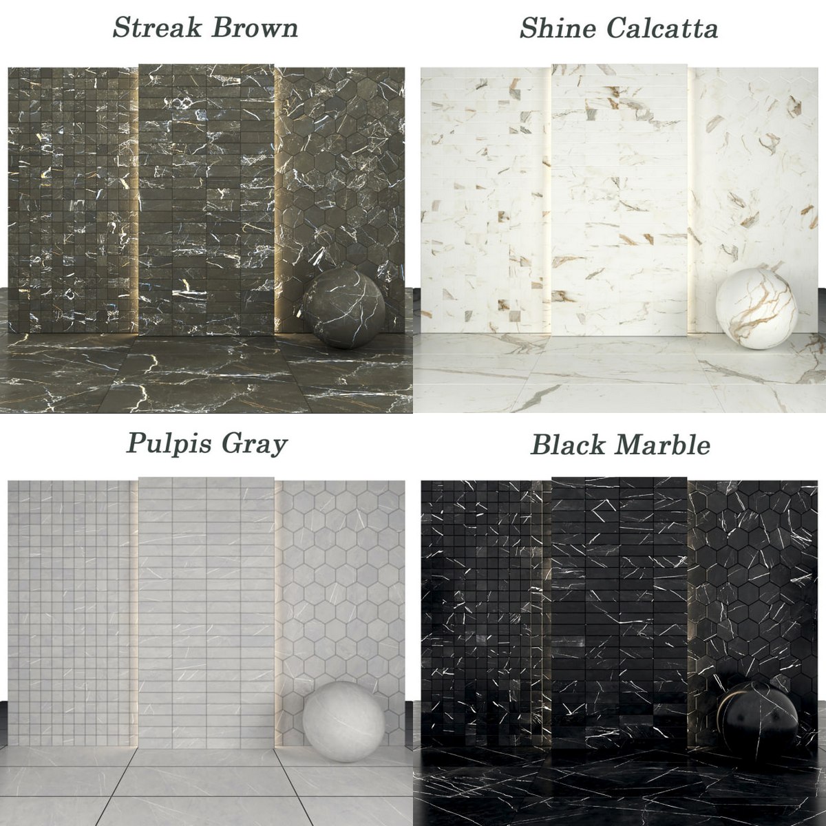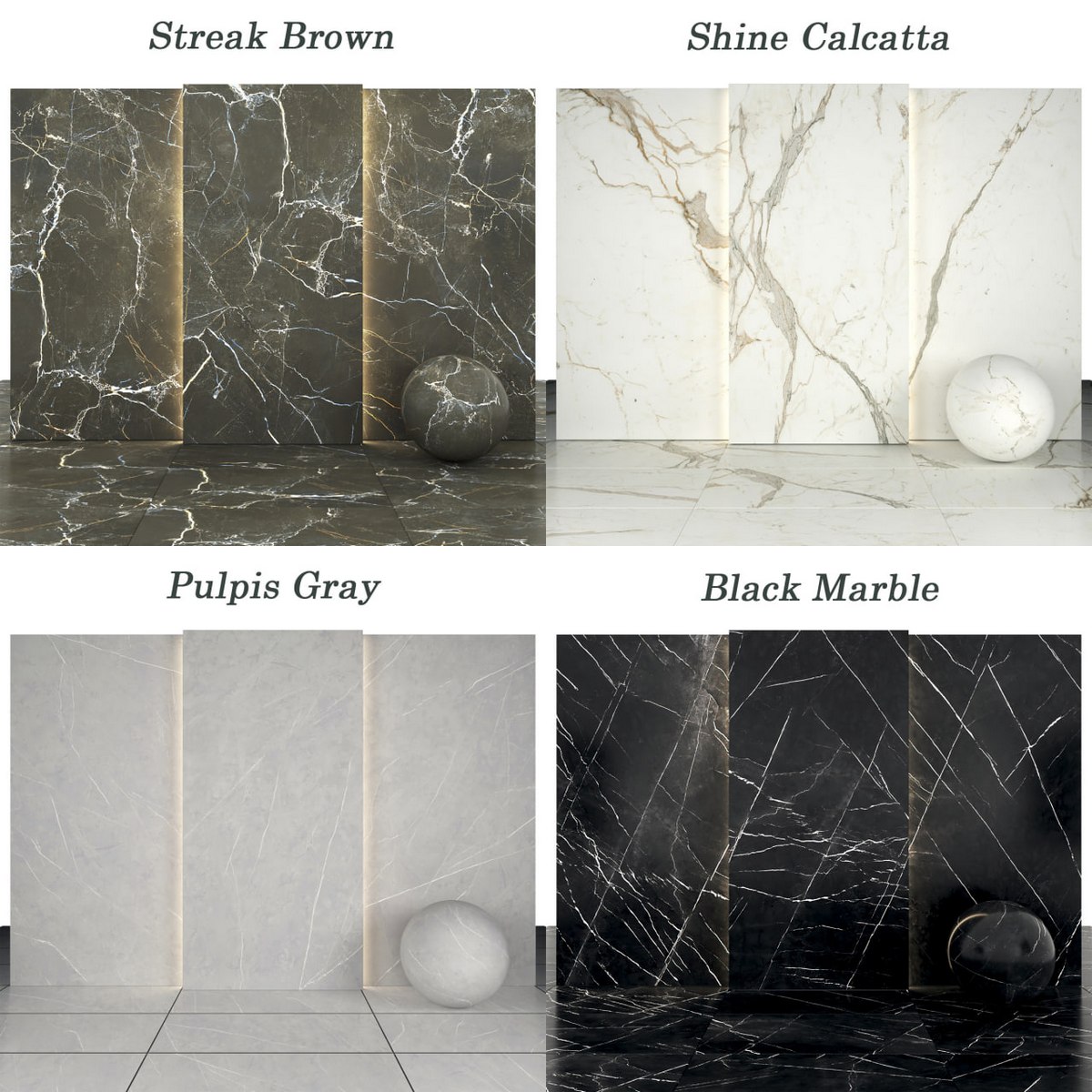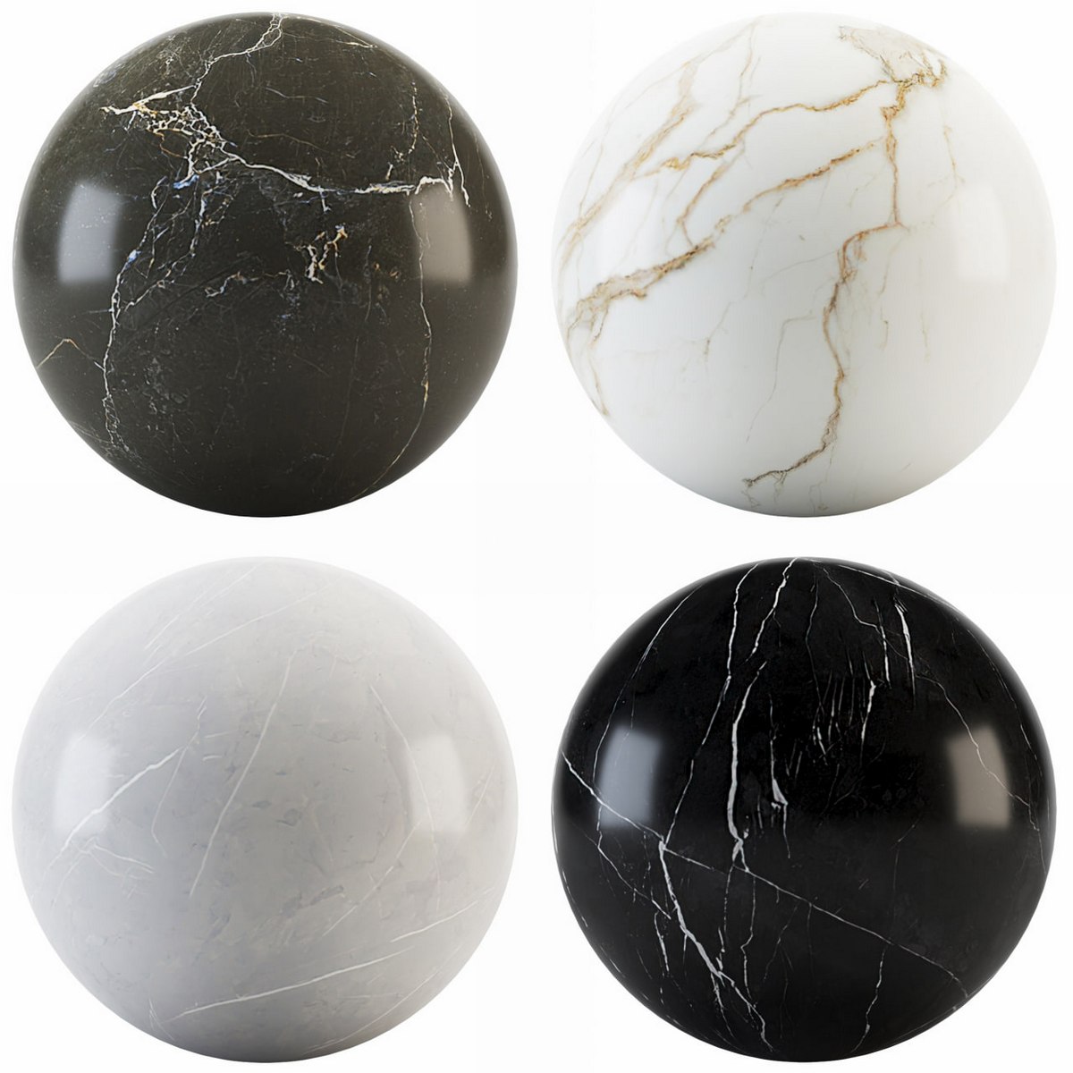 Description: 6 texture Shine Calacatta Marble with glossiness Maps 6 texture Pulpis Gray Marble with glossiness Map, normal Map and height Map 7 texture Black Marble with glossiness Maps 6 texture Streak Brown Marble with glossiness Maps Size textures are: 1200p * 2400p |