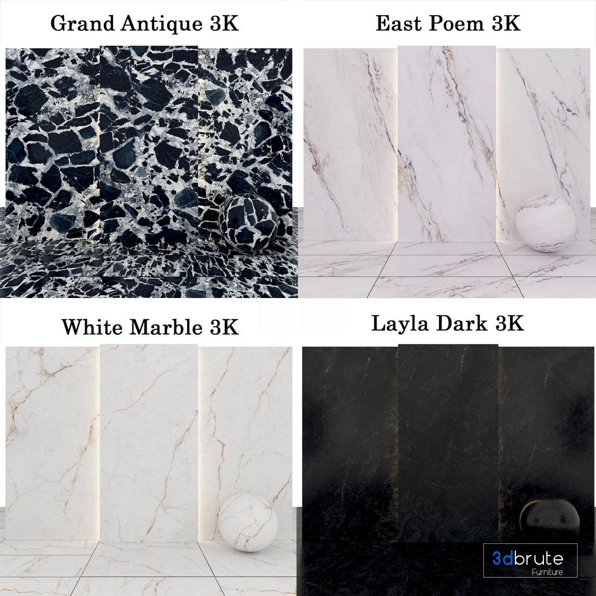 Description: 6 texture Grand Antique Marble with glossiness Map, normal Map and height Map 5 texture Layla Dark Marble with glossiness Map, normal Map and height Map 4 texture East poem Marble with glossiness Map, normal Map and height Map 4 texture White Marble with glossiness Map, normal Map and height Map Size textures are: 1500p * 3000p no use Plugins |