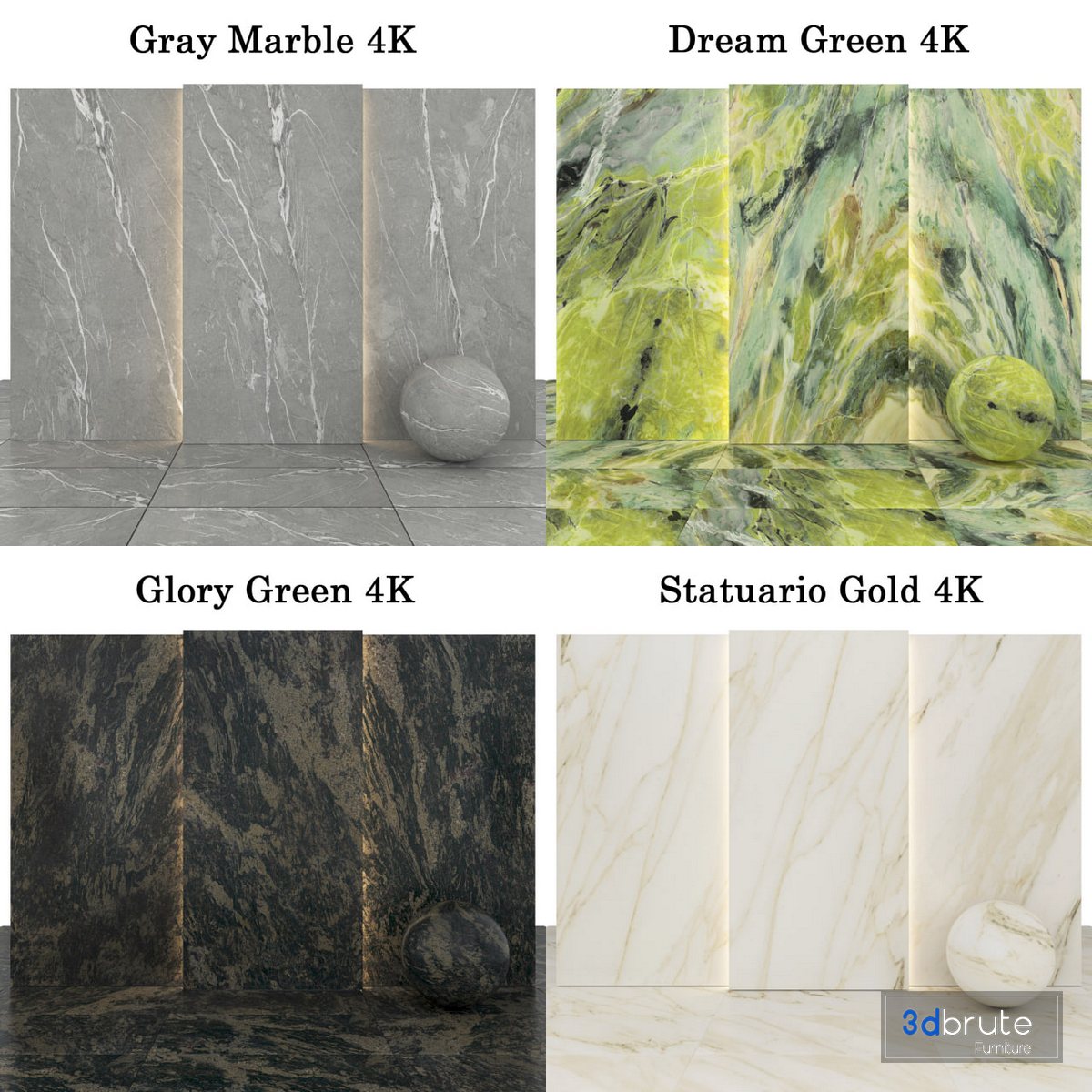 Description: 9 texture Dream Green Marble with glossiness Maps 7 texture Statuario Gold Marble with glossiness Maps 5 texture Glory Green Marble with glossiness Maps 5 texture Gray Marble with glossiness Maps, normal Maps and height Maps Size textures are: 2000p * 4000p no use Plugins |