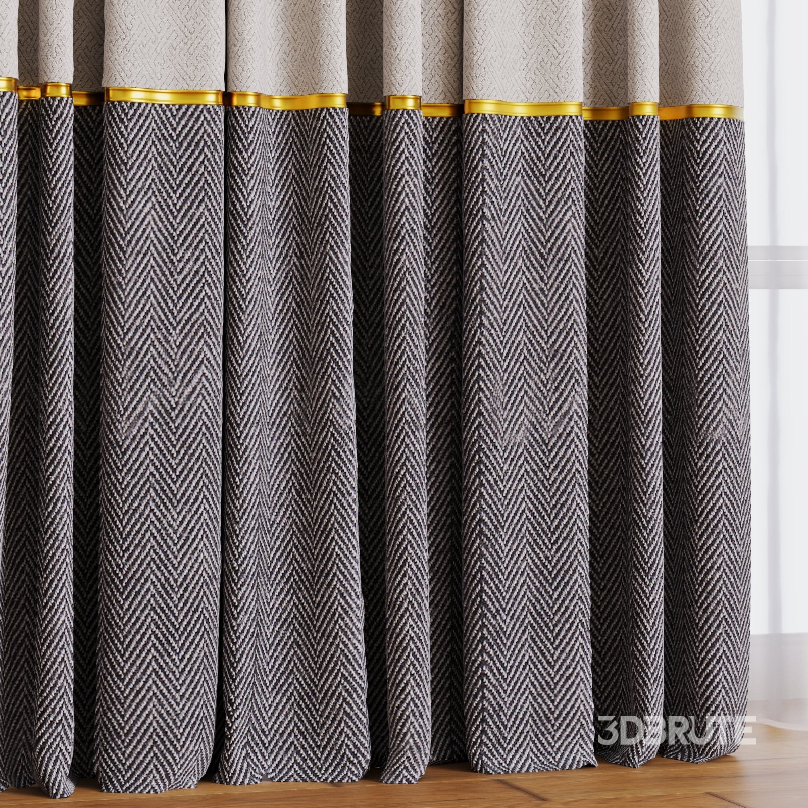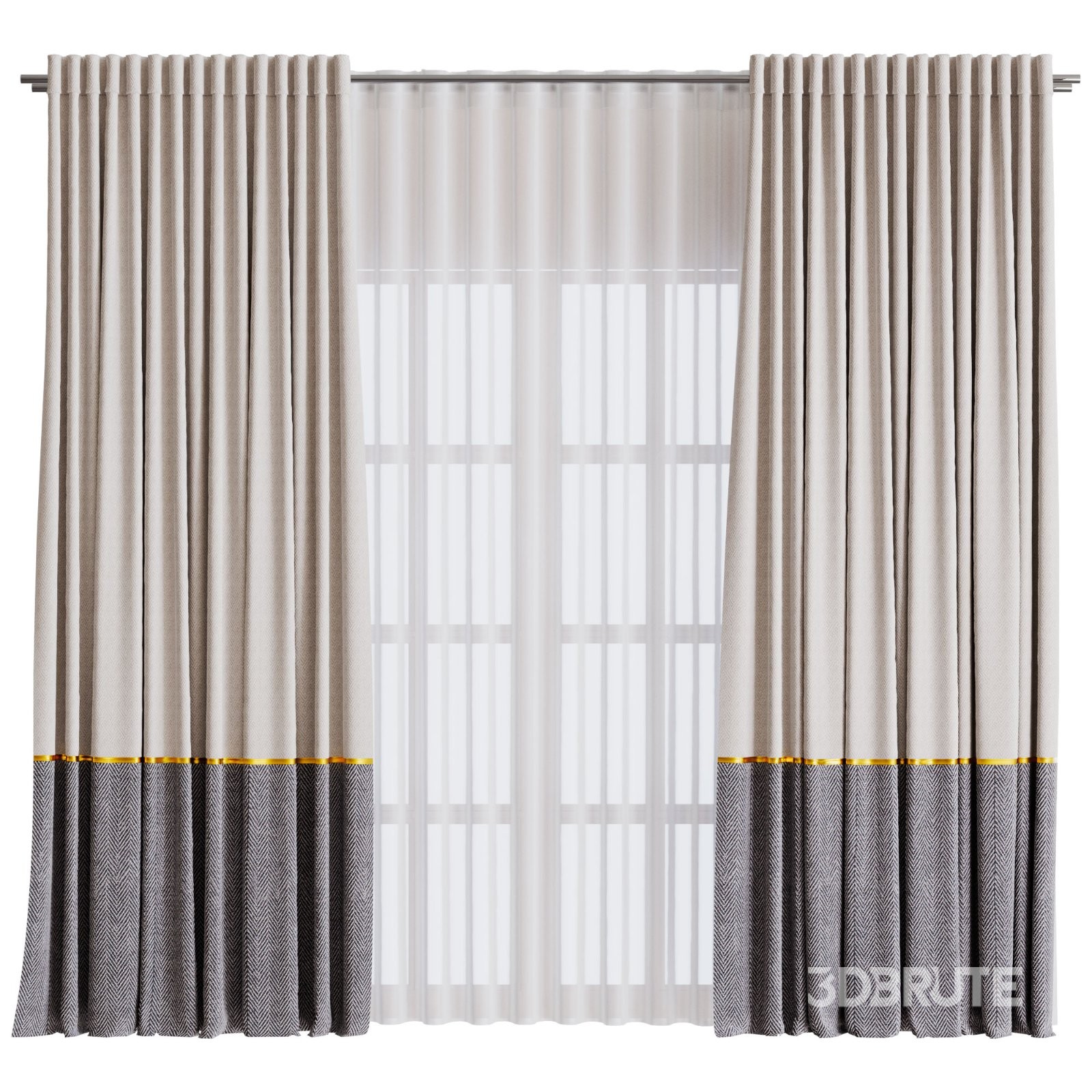 Curtains #02 This curtain contains a set of elegant, dual-tone curtains hanging on a curtain rod. The top portion of the curtains is a light beige, while the bottom portion is a darker gray, accented with a subtle gold trim between the two colors. Behind the curtains, a sheer white layer allows light to filter through, providing a soft and sophisticated look. The design conveys a modern and stylish aesthetic, suitable for contemporary interior decor. Polys: 279,655Verts: 280 682File formats: Fbx, Obj |