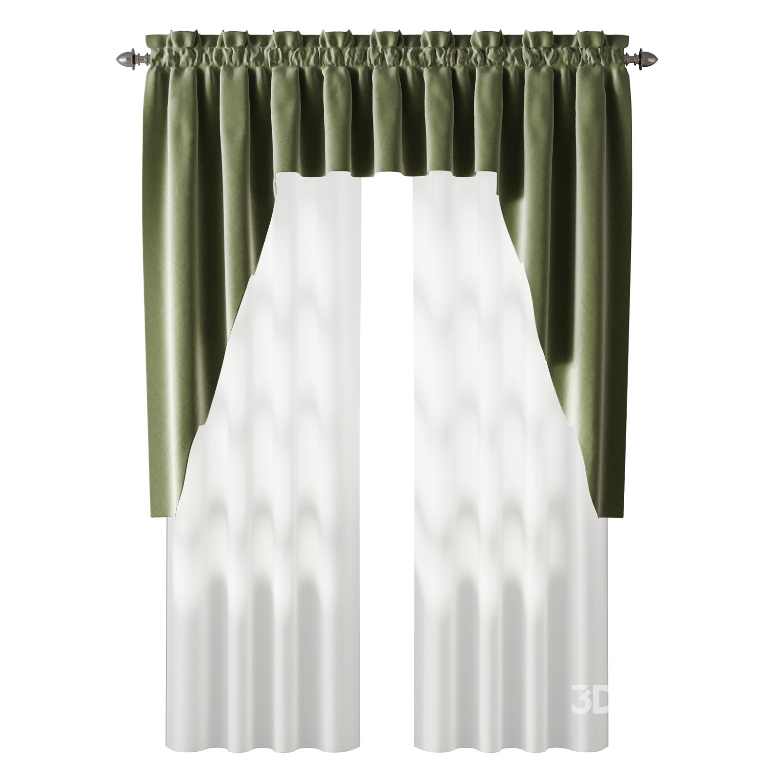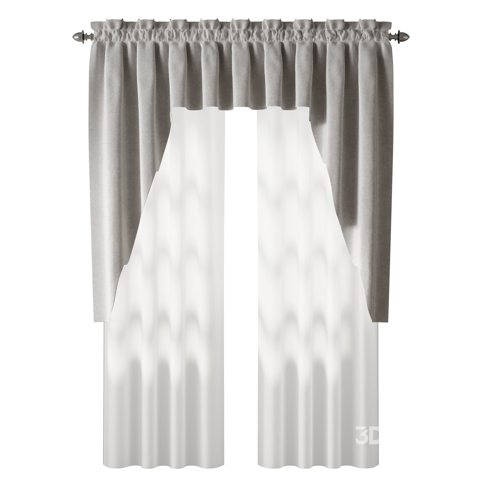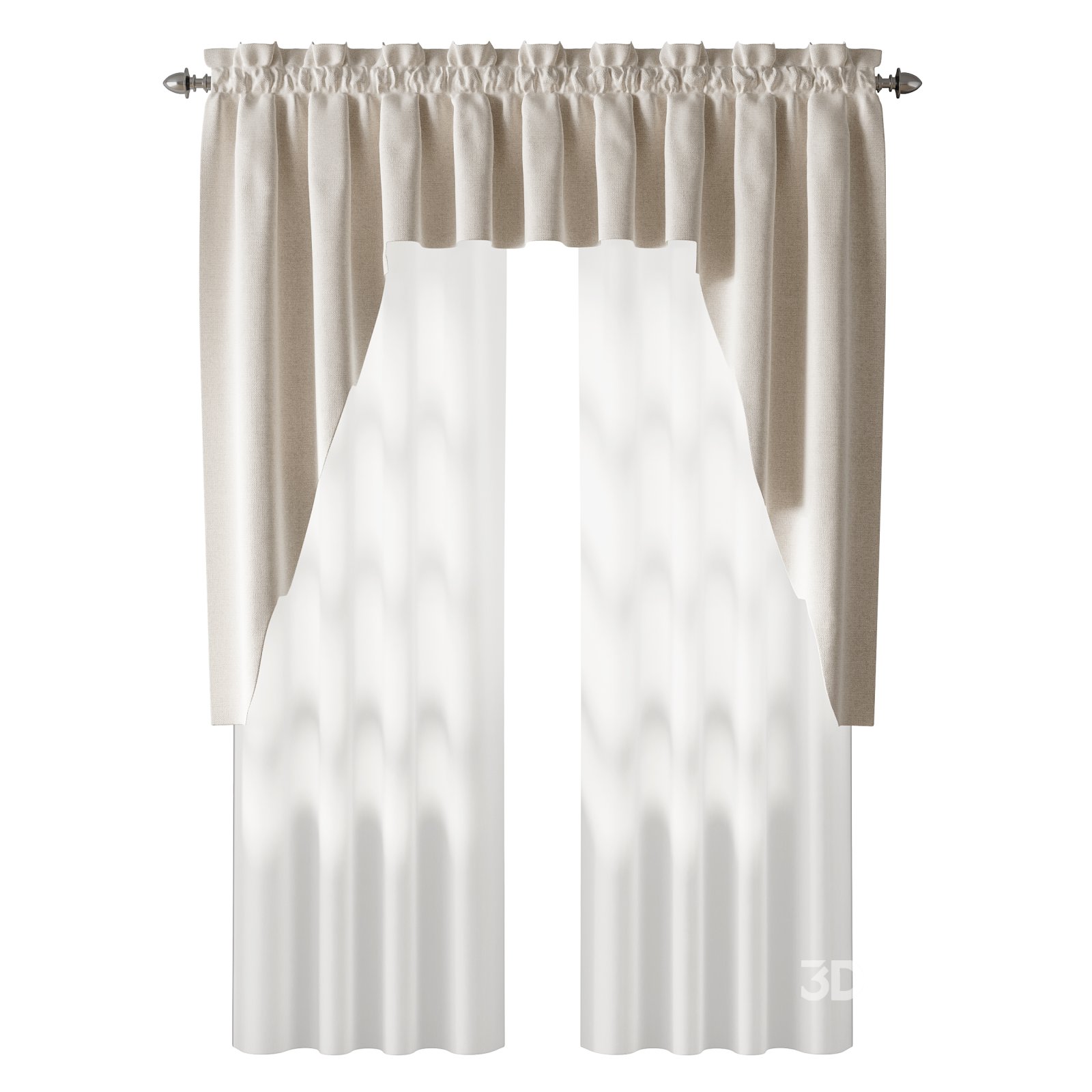 Description: A detailed 3D model of elegant curtains featuring a soft beige top drape and semi-transparent white fabric below. The model showcases realistic fabric folds, subtle light diffusion, and refined material textures suitable for high-quality interior visualizations. Perfect for living rooms, bedrooms, or decorative window designs, this model ensures an authentic and natural appearance in both daylight and artificial lighting setups.
