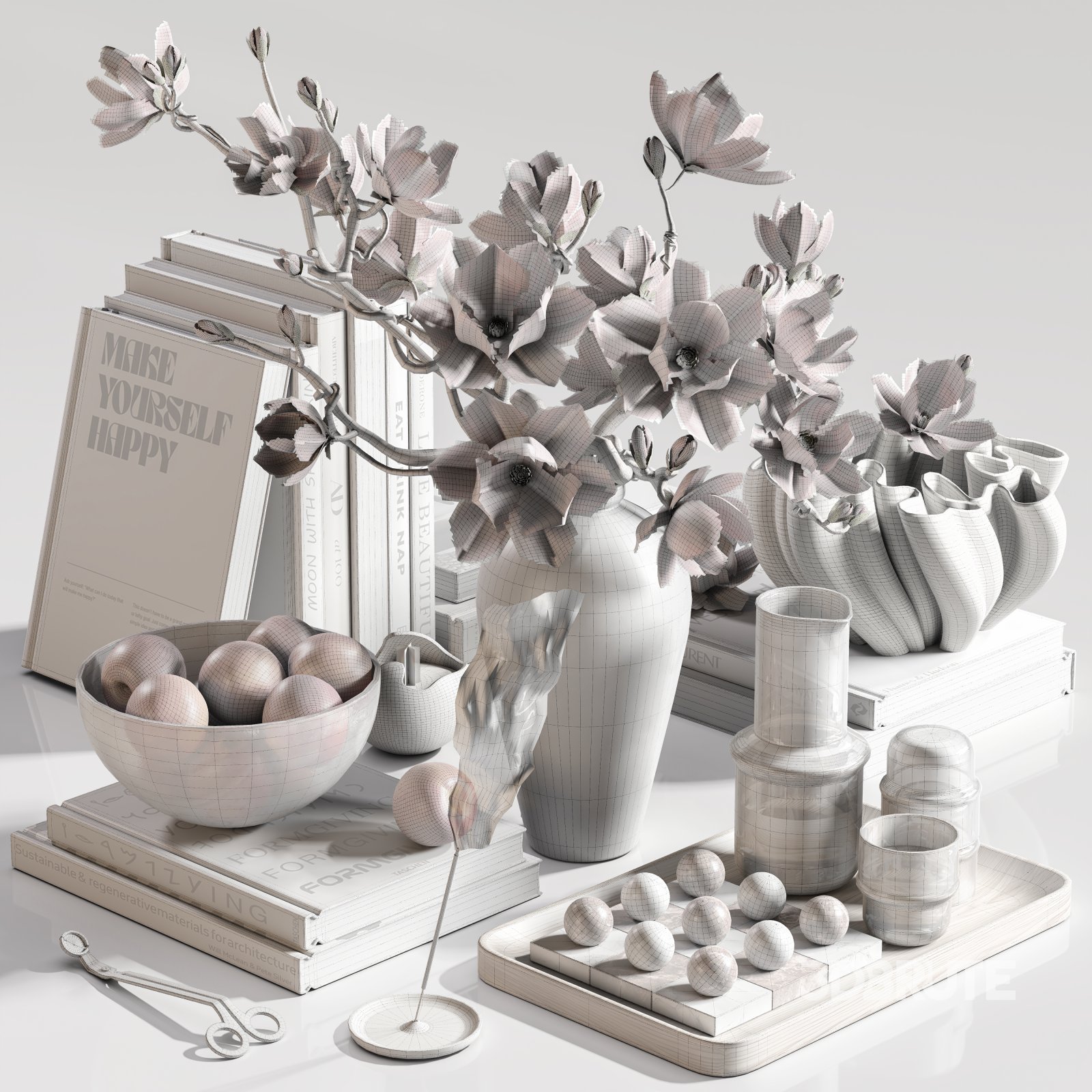 • Book Stack Decor – Carefully styled books with neutral and modern covers, functioning as platforms and backdrops to highlight each object’s silhouette and proportion. Texts include interior design themes and minimal type layouts.
