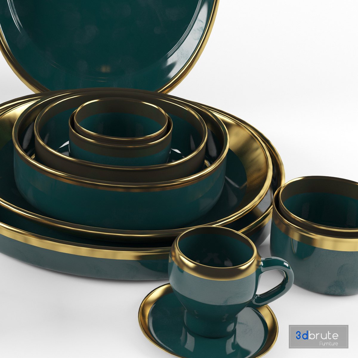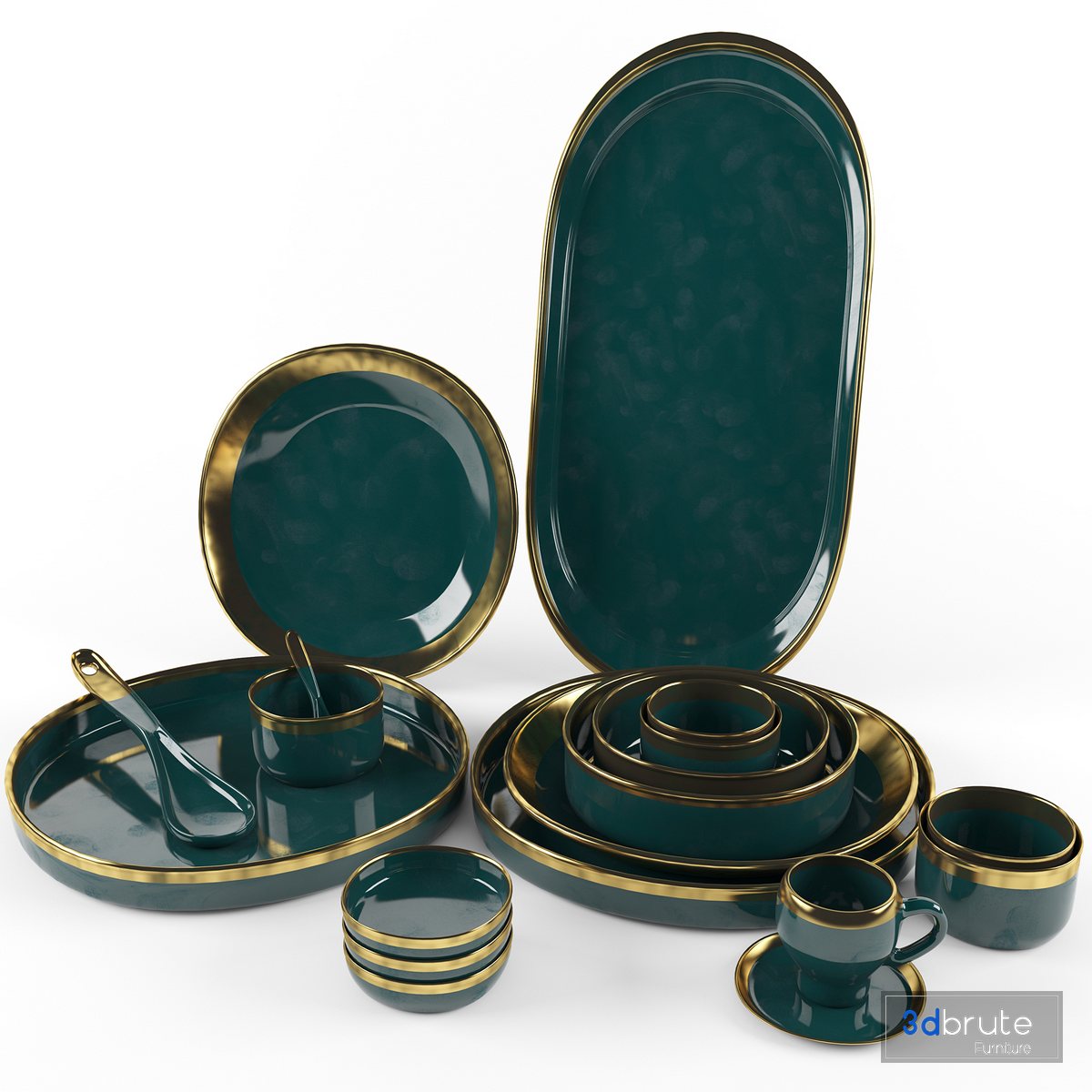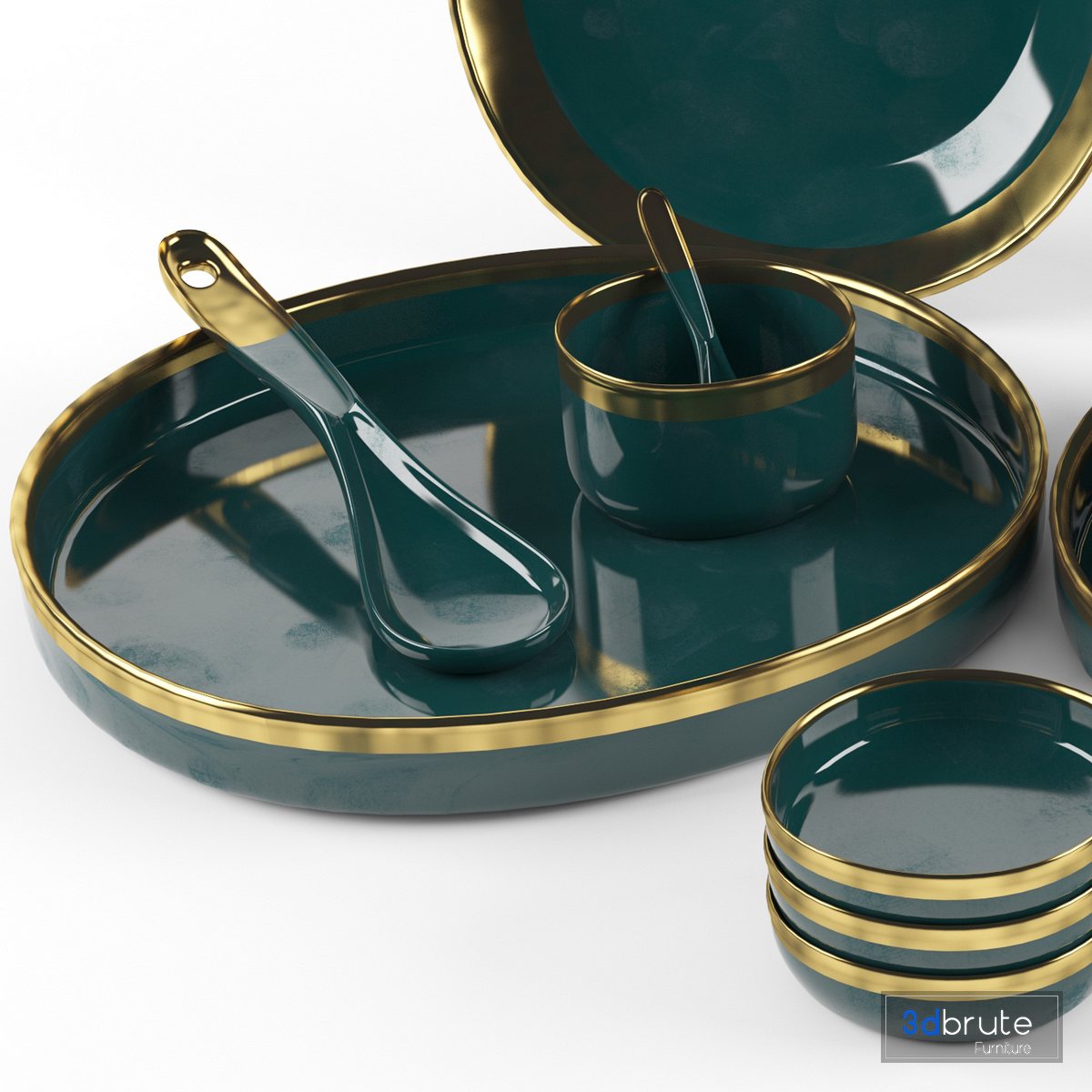 Description: Name: dishes set in green and gold Type: model Format: 3Ds Max 2014 Export: FBX, OBJ, 3DS, MAT Render: VRay (4.2) |