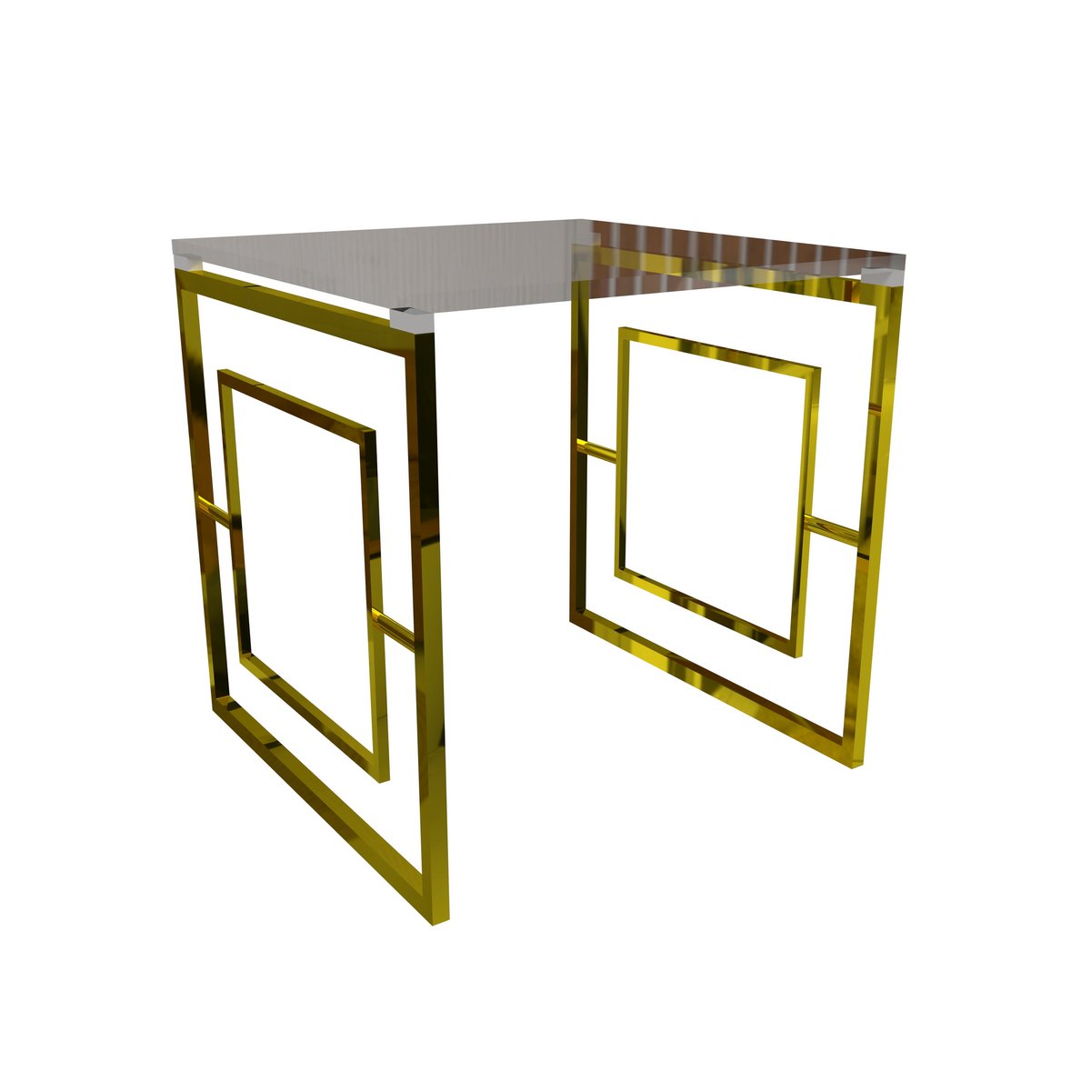 Duraisamy End Table The base is made of stainless steel with a smoked glass top (Square Shape). Art-Deco style keyhole of geometric trellis sides Tempered glass top The base comes in shiny silver chrome or gold. Easy and quick assembly Matching Coffee and Sofa Table are sold separately |
