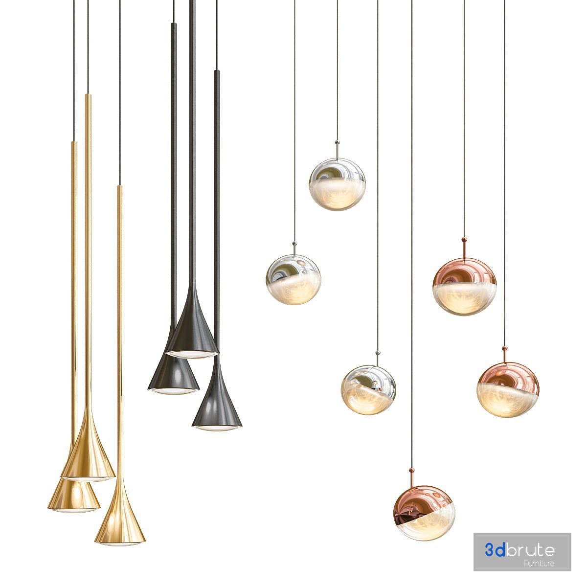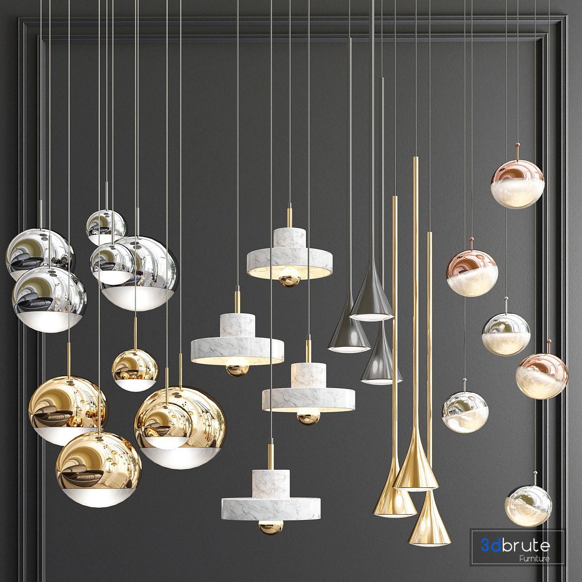 Description: 1. Tom Dixon - Mirror Ball 5 light 2. Marble pendant light 3.Faldo pendant 4. Dora 3 LED Linear Suspension Light |