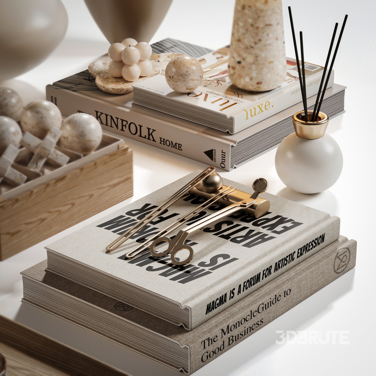 - Designer books including Kinfolk, Louis Vuitton, and The Monocle Guide