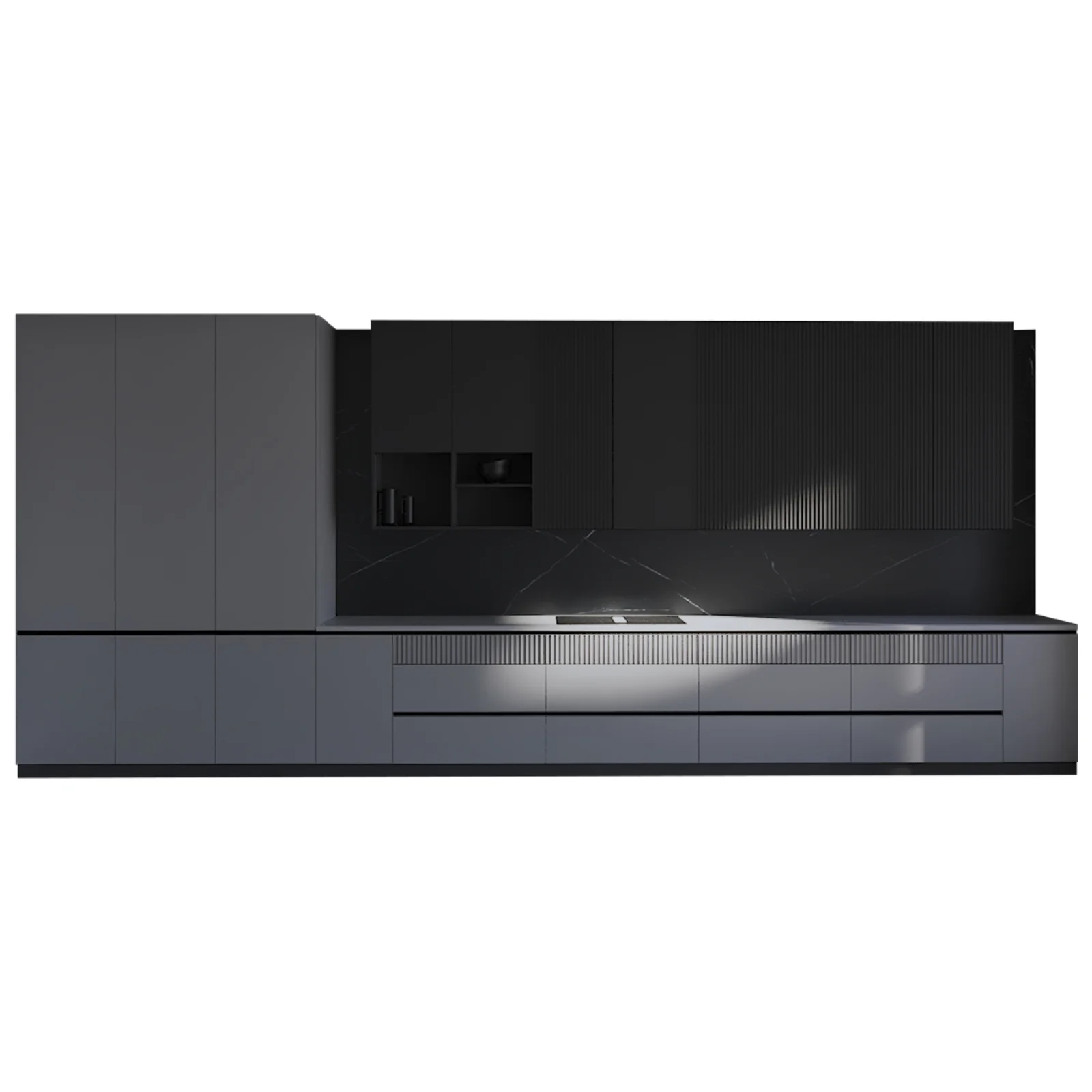 Modern kitchen design with gray and black MDF and Marquina ceramics |