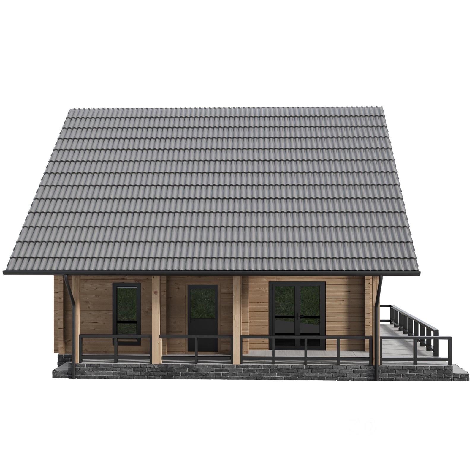 Description: A cozy two-story wooden house with a steep gable roof, wide veranda, and modern black-framed windows. The natural timber facade enhances the rustic charm, while the expansive glazing brings in natural light, making it ideal for countryside or mountain settings. The structure combines traditional warmth with contemporary details, perfect for 3D scenes involving nature, residential retreats, or architectural visualization.