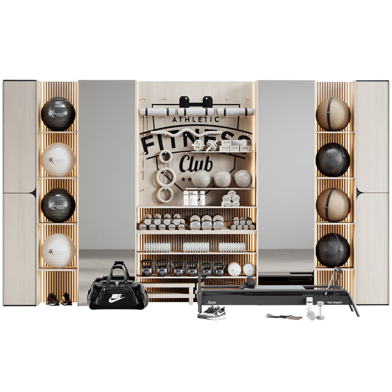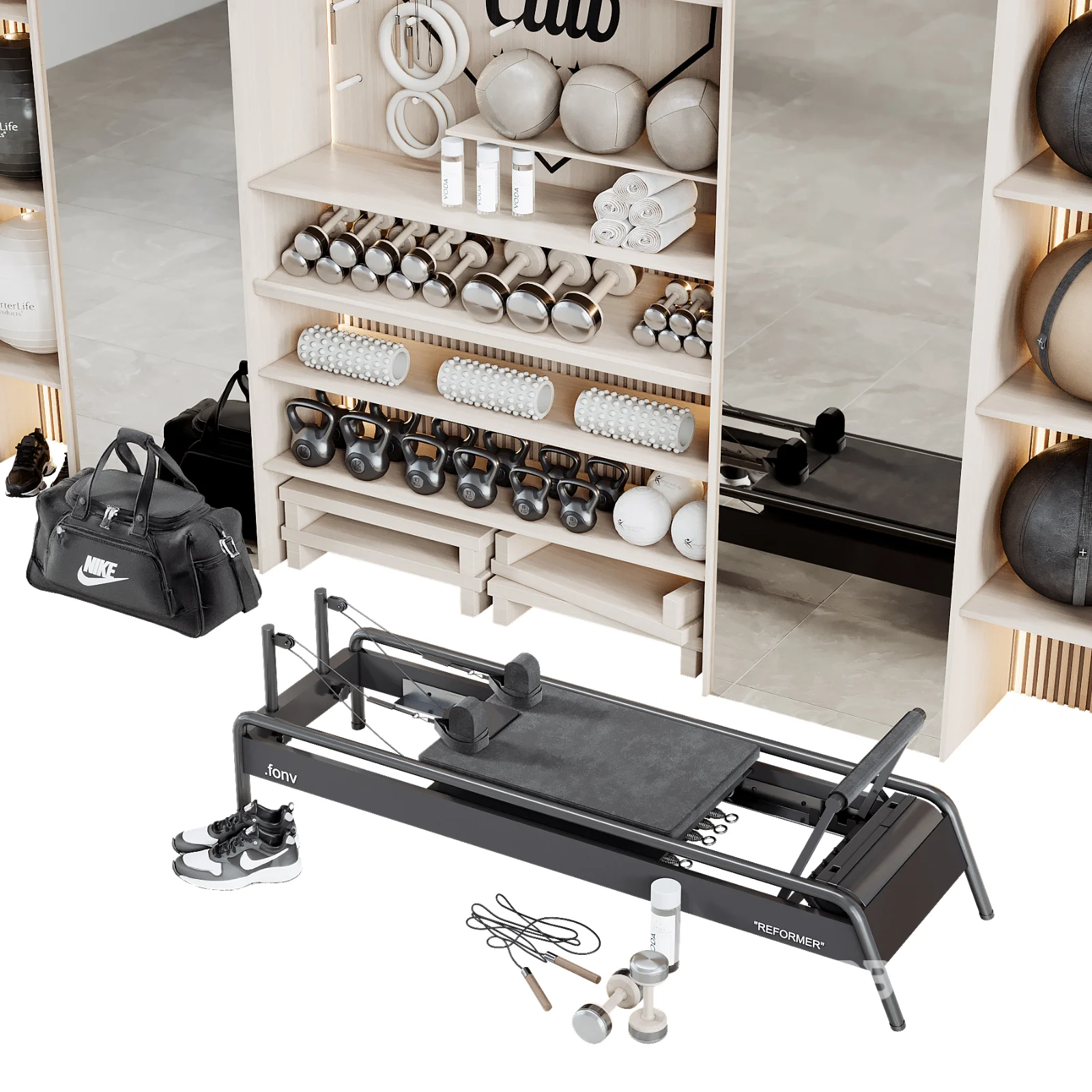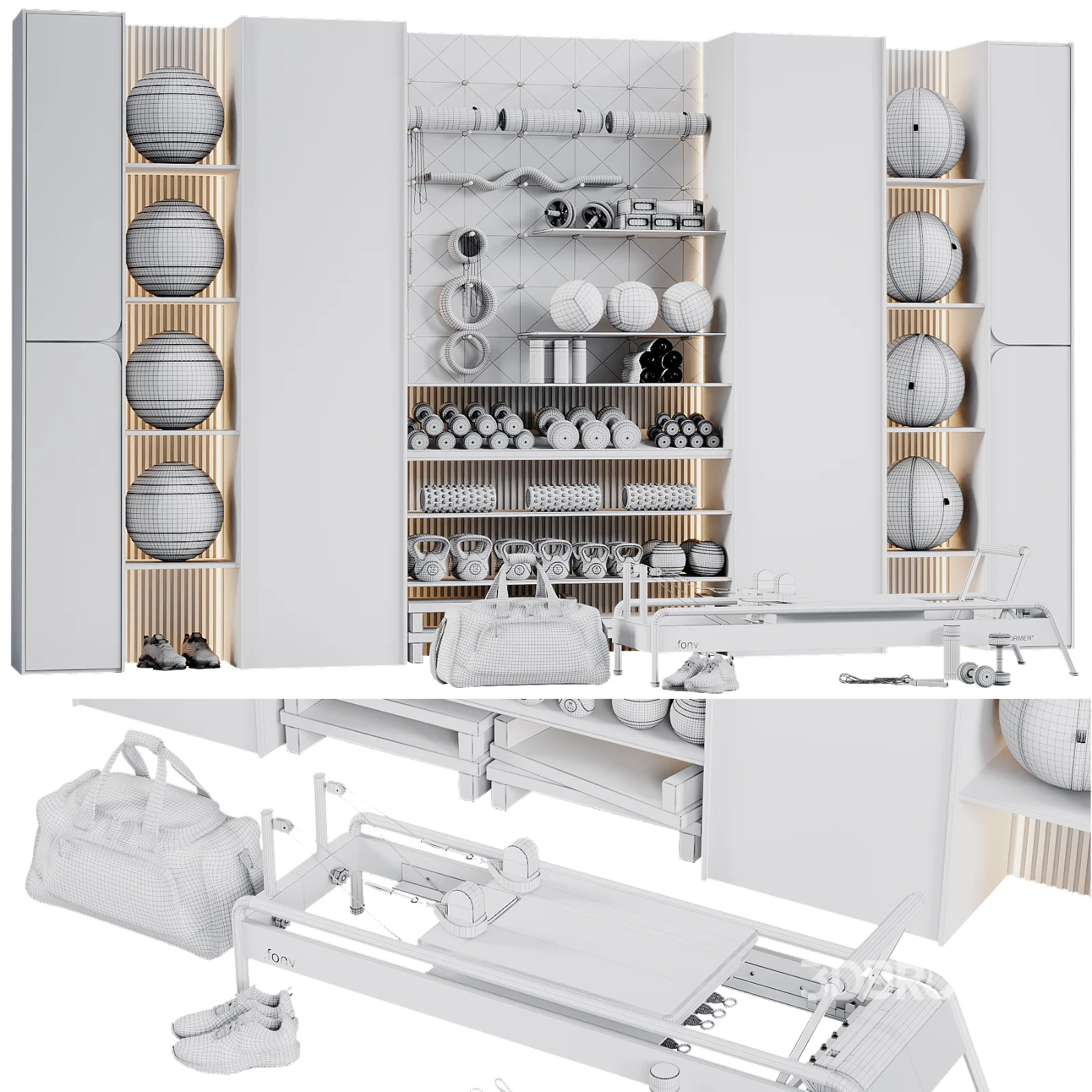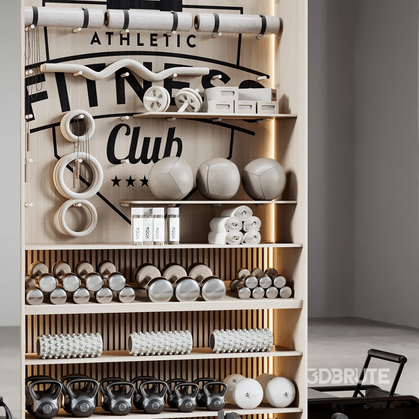 High-quality 3D model of a Wall-Mounted Gym Equipment Rack – perfect for modern home gyms, fitness studios, and interior visualization projects. Materials CoronaLegacyMtl + Vray 3dsMax 2016 + obj Poly: 597100 |