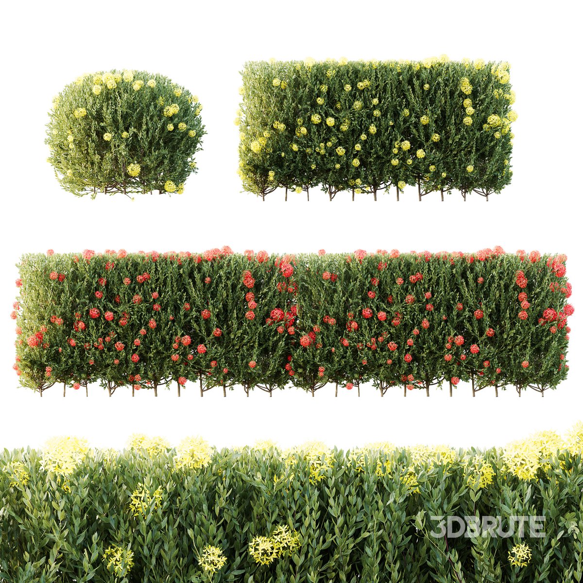 HQ Plants Ixora Jasmine Gardens Chinese Dwarf Coccinea Red Yellow Box Ixora is a genus of flowering plants in the family Rubiaceae. It is the only genus in the tribe Ixoreae. It consists of tropical evergreen trees and shrubs and holds around 544 species. Though native to the tropical and subtropical areas throughout the world, its center of diversity is in Tropical Asia. Ixora also grows commonly in subtropical climates in the United States, such as Florida where it is commonly known as West Indian jasmine. 2 Different 3D models in the scene Height:100 cm & 100 cm 1- Materials is archive (material library) Corona mtl + Vray mtl + Standard mtl 2-Polys: 990k + Verts: 2068k 3- 4K texture + 4K material 4- JPEG (texture), MAX + MTL + OBJ 5- 3dmodels: MAX + OBJ 6- Corona render + Vray render (Renderer Engine-MAX) Standard render (Renderer Engine-OBJ) 7- Models have unwrapped overlapping and maps supported traditional 3ds Max texturing. Note: To use the max file you need to use at 3dsmax 2015 |