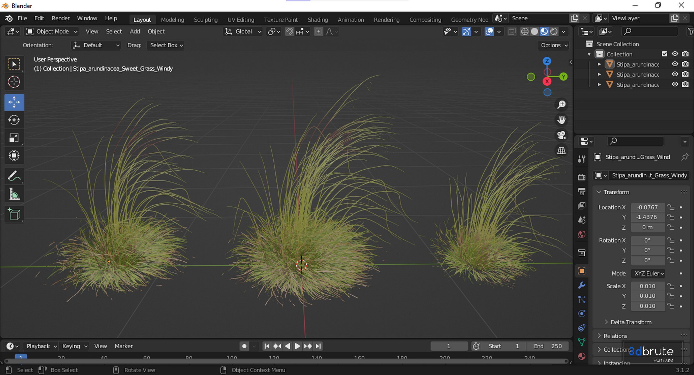 Description: Stipa (Stipa arundinacea Pheasant Tails) - Drought tolerant ornamental grasses add great texture and interest in the mixed border or xeriscape garden and this Pheasant's Tail grass is no exception. Grown from Stipa seeds, this clumping evergreen has narrow blades that arch gracefully and are streaked with coppery orange. In midsummer, pendent flowers open that are purplish green and give a misty appearance. Also called New Zealand Wind Grass, this drought tolerant ornamental grass is popular for its delightful form, colors, and drought tolerance where water conservation is becoming more and more important. 3 Different 3D models in the scene Height: 1200mm & 1000mm & 1300mm 1- Materials is archive (material library) Note: - To use the max file you need to use at 3dsmax 2015 + Blender 2.9 + Maya 2018 If you have any problems for setting up the models, |