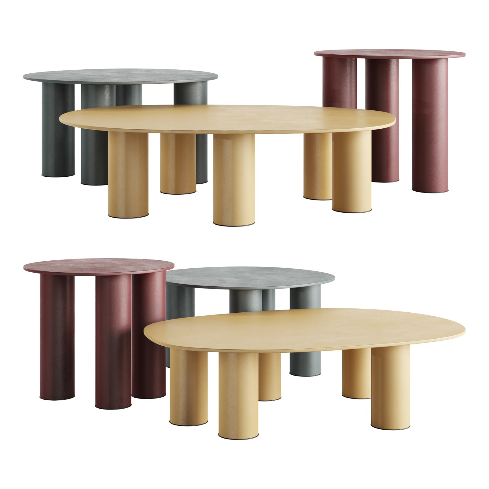 HYPPO The result of playful experimentation, the Hyppo coffee-table family is designed for outdoor use but adapts with versatility to indoor spaces. The inspiration, clear even from the name itself, is linked to the morphology of the hippopotamus and is revealed in the design of the aluminium legs, large and sculptural. The contrasting top, made with coloured paste laminate, stands out instead for its thin profile and deliberately irregular contour, reminiscent of the animal’s body. Available in different diameters and heights, Hyppo’s variants can be combined to recreate islands of coffee tables, welcoming the placement in any corner or living room. The colour palette, which includes ochre, crimson, quartz green, and petroleum green in a matte finish, also promotes the complementarity of the combination. Inspired by S-CAB |