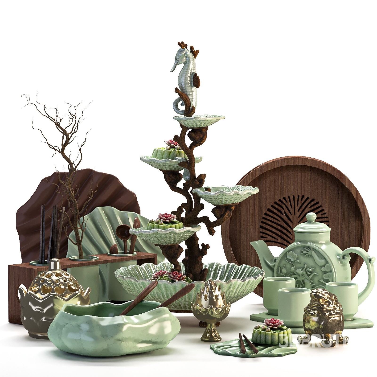 Technical Description Kitchen Accessory 08 - Chinese Style A detailed 3D model of a luxurious Chinese-style kitchen accessory set designed with a blend of traditional art and elegant craftsmanship. The collection features handcrafted elements such as teapots, trays, bowls, and decorative stands inspired by nature and Eastern aesthetics. The centerpiece, a seahorse-shaped serving stand surrounded by ceramic lotus flowers, adds a sophisticated and artistic touch to any interior visualization. Each object is modeled with precise geometry and realistic materials, ideal for close-up renders, still-life compositions, and interior design scenes. The warm contrast between smooth ceramics and dark wood creates a refined, cultural atmosphere suitable for Asian-themed or eclectic kitchen designs. Features: Dimensions: 109×108 cm (Height: 82 cm) Polygon count: 507,036 Vertex count: 509,215 Formats: .MAX (2018), .FBX, .OBJ Render engines: V-Ray 6 / Corona 12 Main materials: Wood, Ceramic |