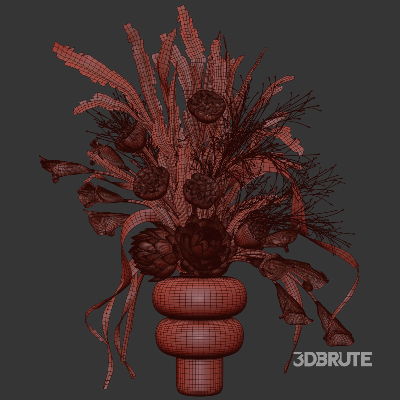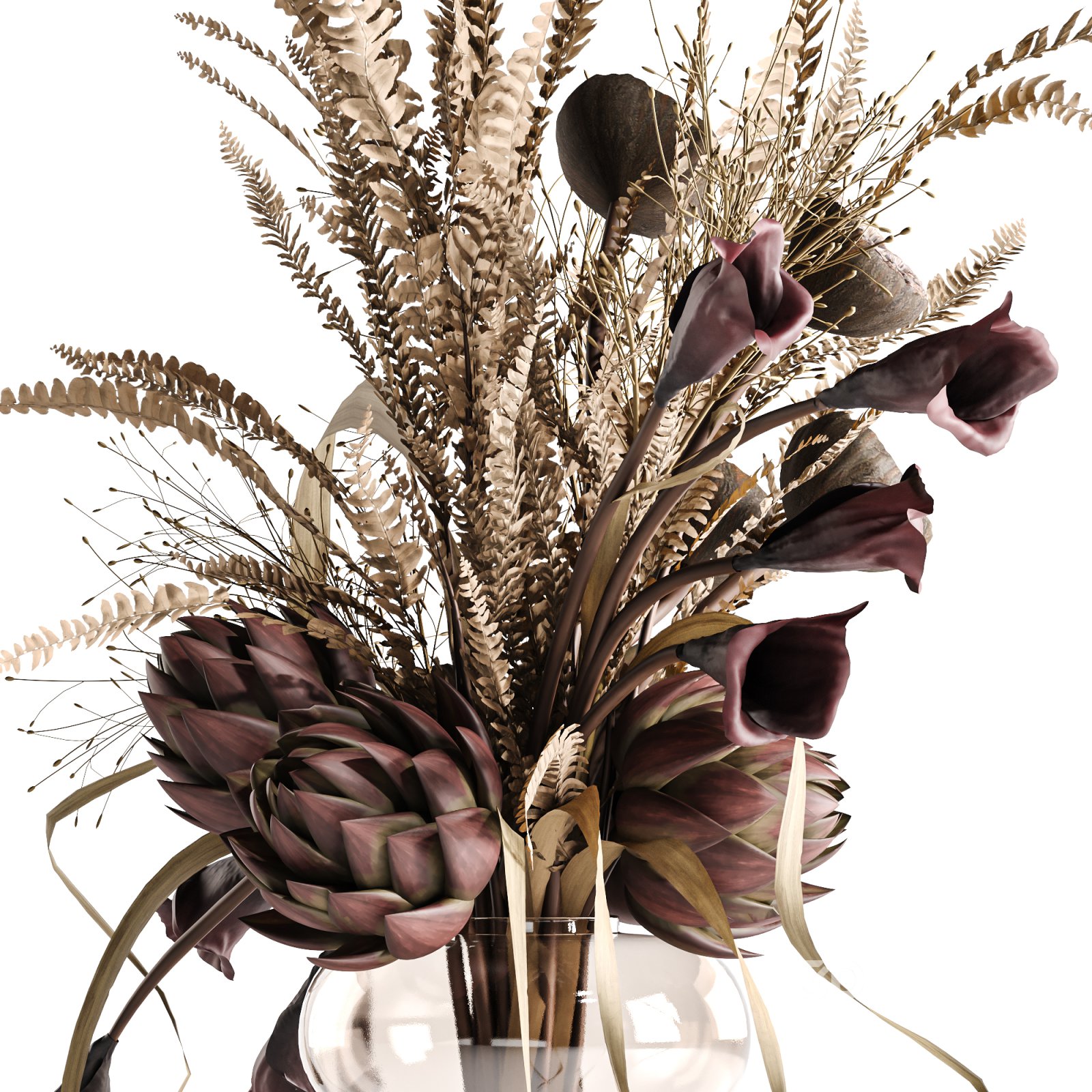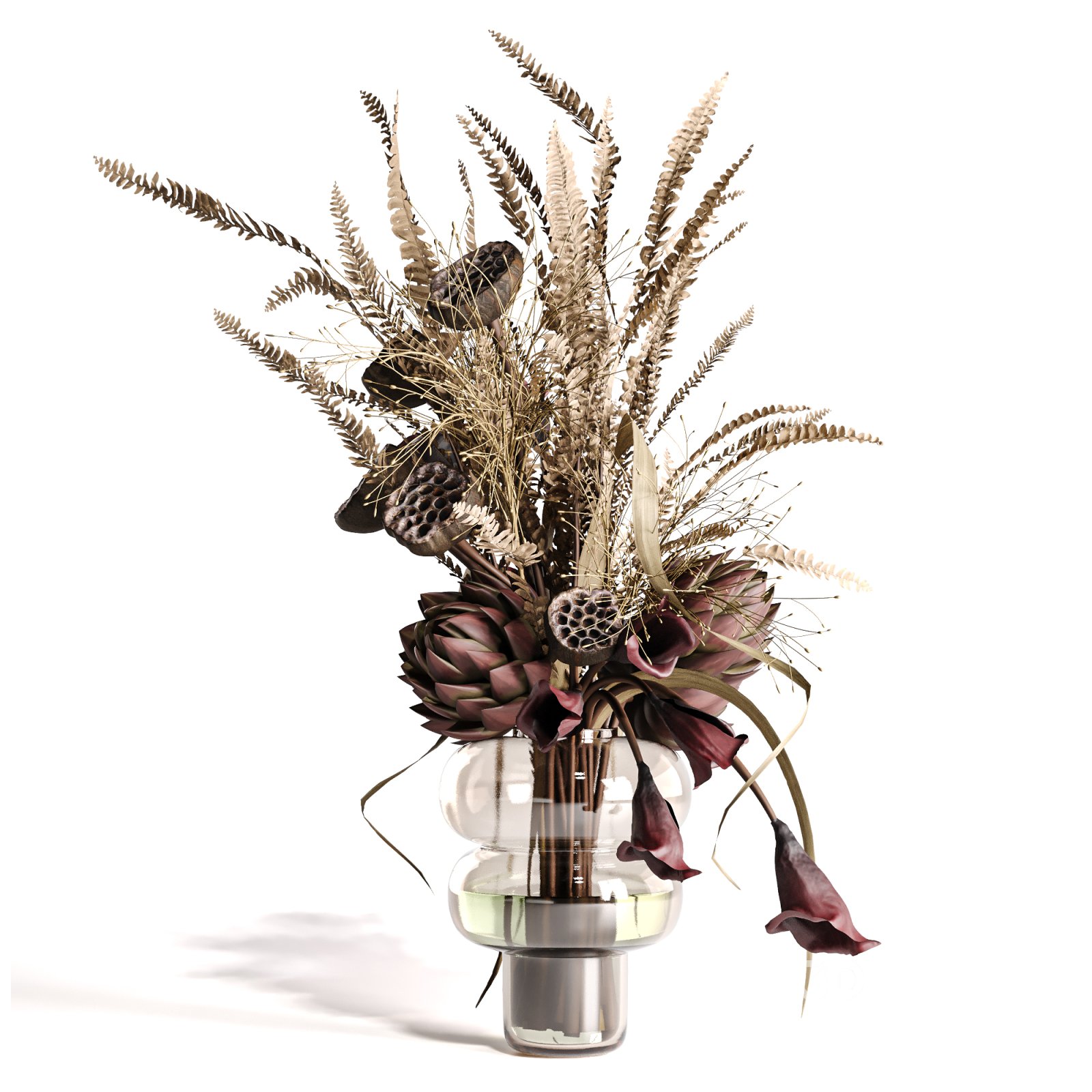 Name: Lotus and Artichoke Dried Set47 A balanced composition of dried plants, lotus pods, artichoke blossoms, and dark calla lilies arranged in a clear glass vase. The mix of muted browns and deep purples gives the piece an earthy, natural tone that fits calm and minimal interiors. All elements are modeled with realistic textures and proportions, keeping a focus on clean shapes and natural flow. The arrangement works well both as a full set and as individual stems for custom layouts. It’s suitable for scenes that need a touch of organic texture without bright colors — ideal for neutral palettes, autumn concepts, or modern rustic spaces. Key Features: Technical Details: Compatibility Notes: Tags: |