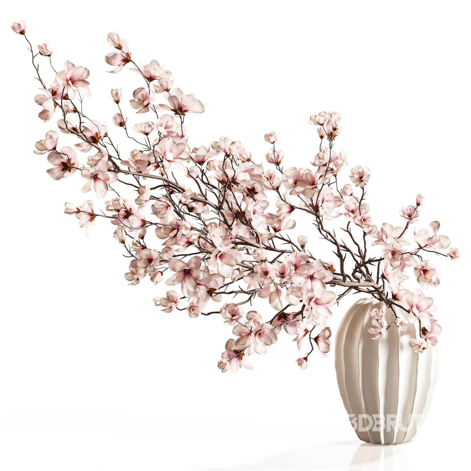 A delicate and elegant decorative arrangement featuring blooming magnolia branches in soft shades of blush pink, gracefully placed in a sculpted white ceramic vase. This piece adds a touch of natural sophistication and timeless charm to any modern or classic interior space. Perfect for use in living rooms, lobbies, or as a hero piece in product visualization scenes.