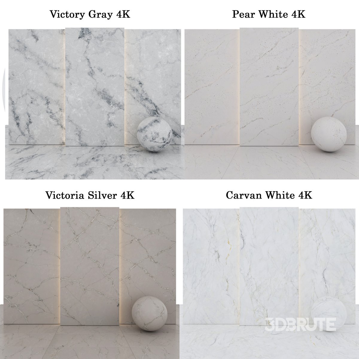 Collection Marble 105 : This collection includes: 10 texture Victory Gray with glossiness Maps 6 texture Carvan White Marble with glossiness Maps 6 texture Pear White Marble with glossiness Maps 6 texture Victoria Silver Marble with glossinessMaps Size textures are: 2000p * 4000p no use Plugins |