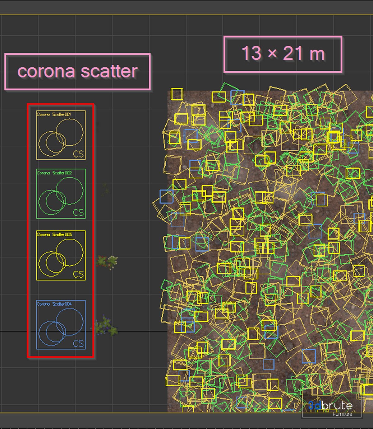 Description: 2- Vray + Standard 3ds max file is also in archive 3- scattered objects are not OBJ, just the main Objects. 4- Corona Scattter settings Screenshots. 5- Materials is archive (material library) 6- Corona Scatter File: Polys: 518k + Verts: 798k 7- 4K texture + 4K material 8- BMP + JPEG (texture), MAX + OBJ + Screenshots. 9- 3dmodels: MAX 2015 + OBJ 10- Corona render + Vray (Renderer Engine-MAX) 11- Models has unwrapped overlapping and |