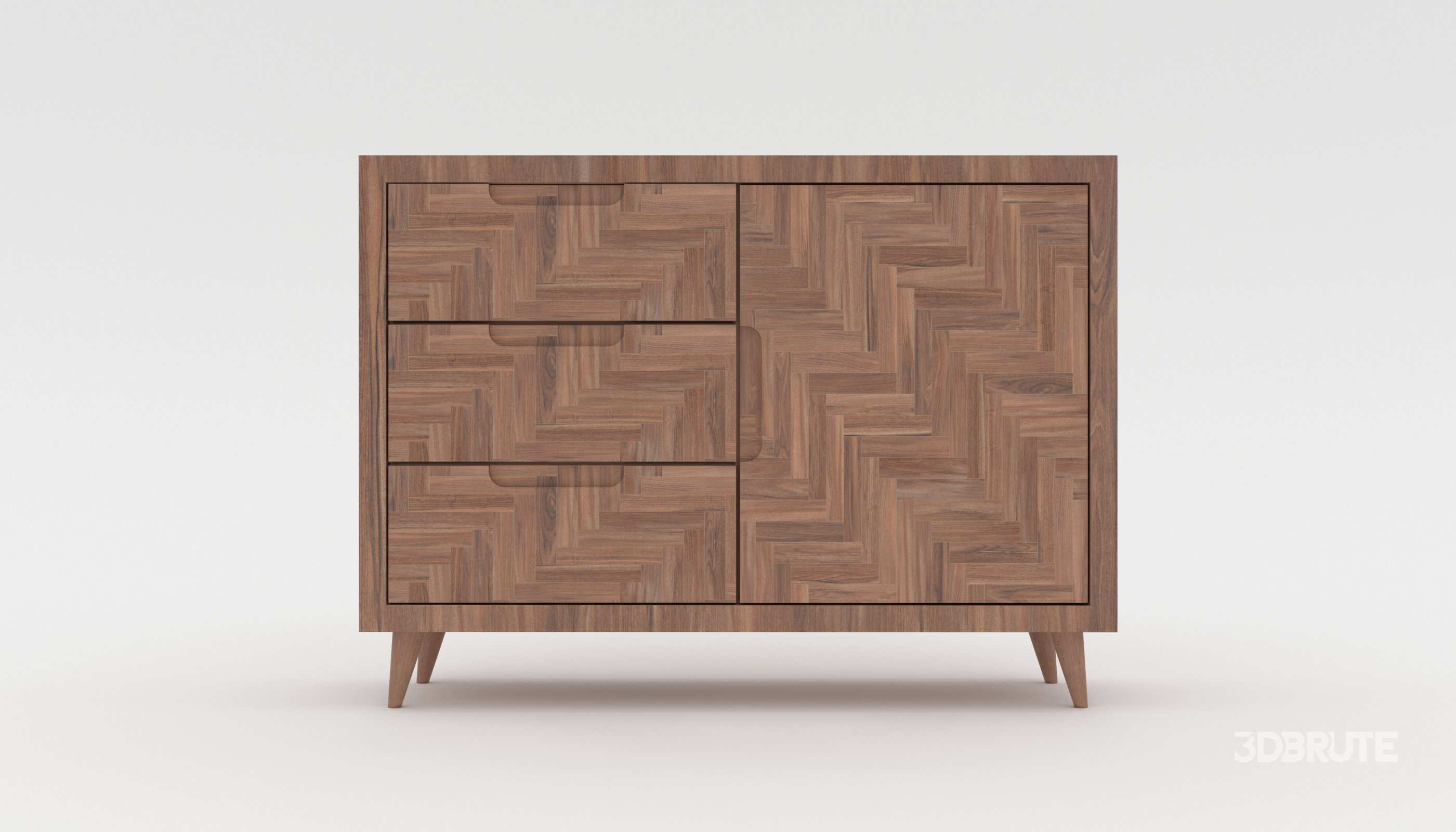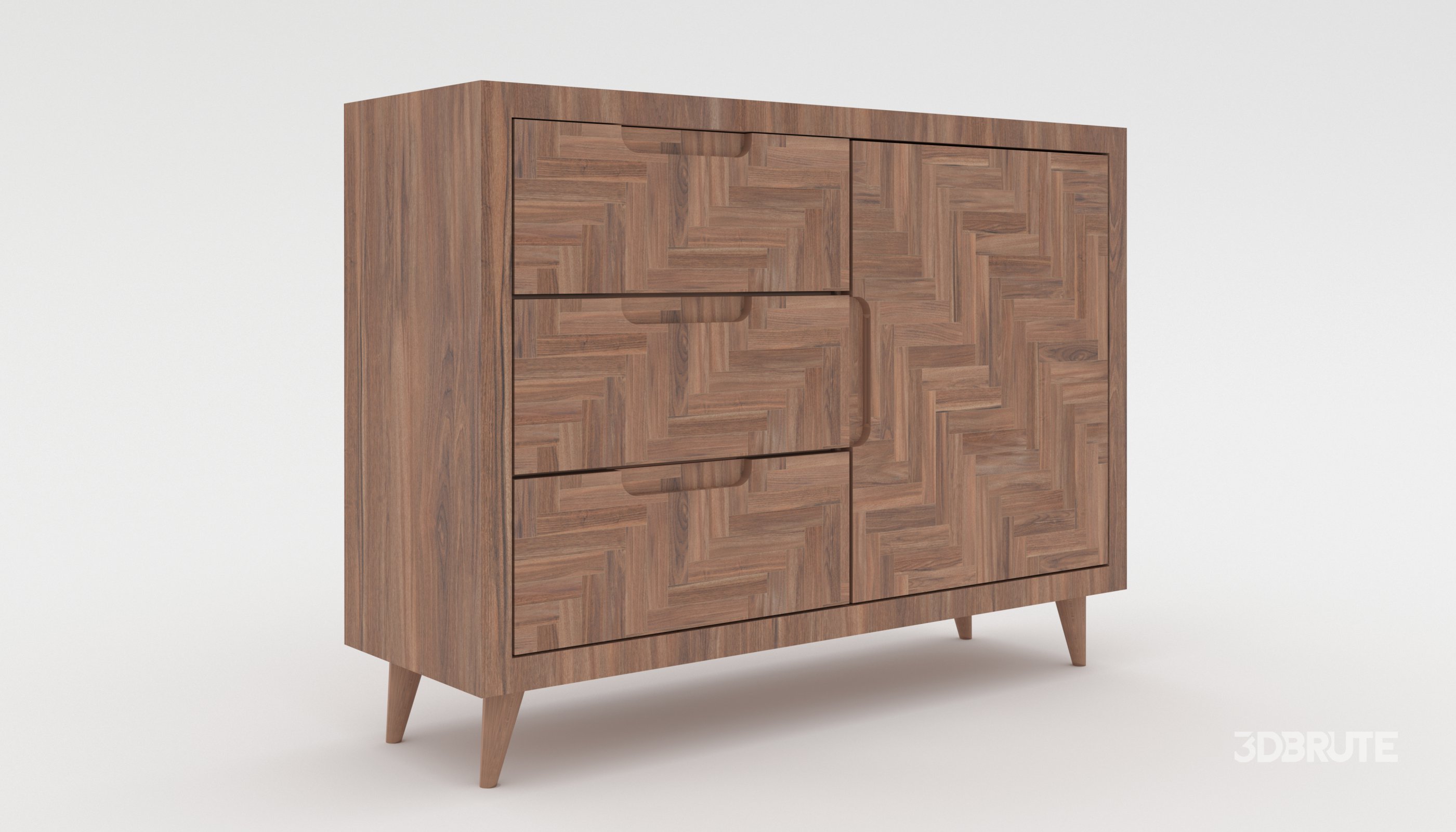 This high-quality 3D model of a mid-century modern wooden cabinet is designed with a stylish herringbone wood pattern and clean minimalist lines. Perfect for interior design projects, architectural visualization, product rendering, VR/AR experiences, and gaming environments. The model features three drawers and one cabinet door, detailed wood textures, and a realistic grain pattern that enhances any modern, Scandinavian, or boho-inspired space. |