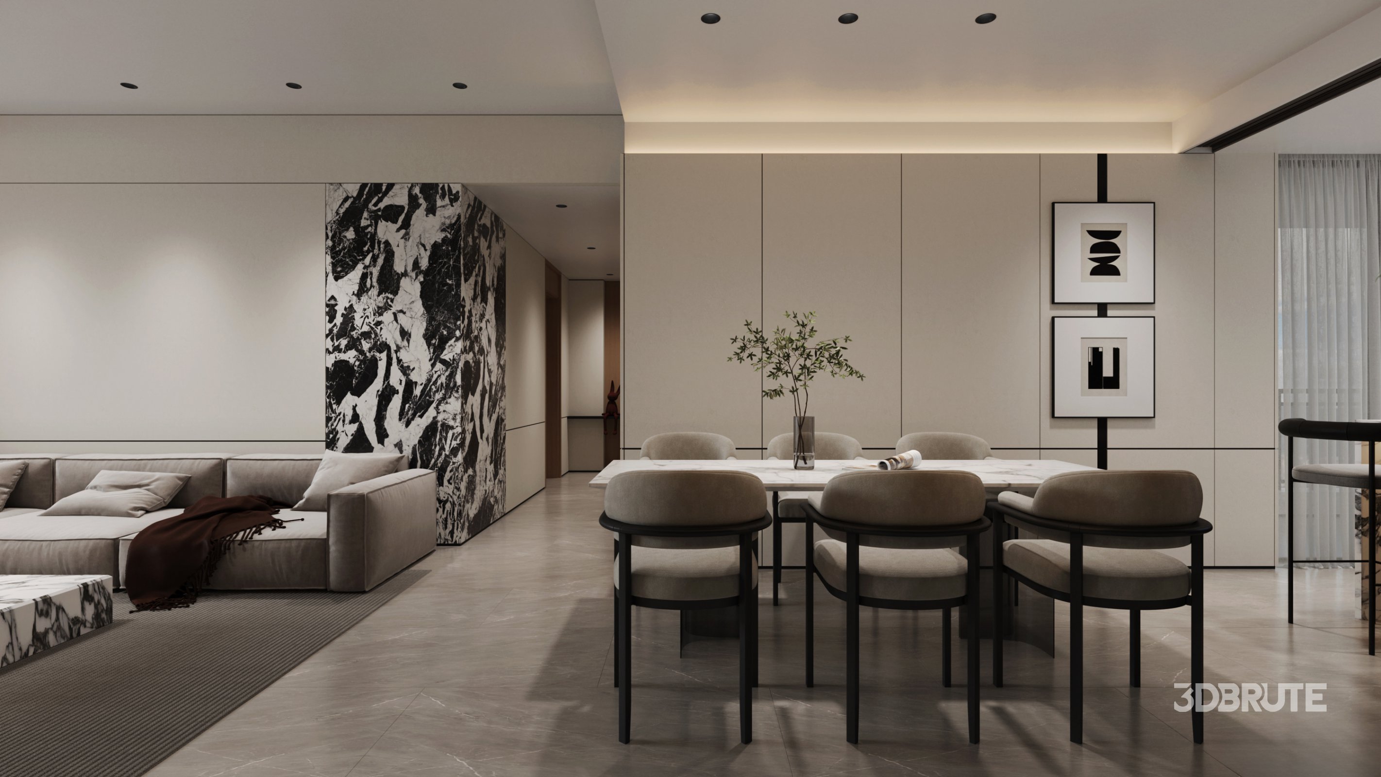 This Modern living room and dining room interior scene 3D scene was built in 3ds Max 2021 and rendered using Corona. It includes clean geometry, proper scene organization, and is optimized for smooth rendering performance. The model setup follows standard practices, making it easy to import and adapt into a variety of workflows. Delivered in MAX format, it is well-suited for architectural visualization, concept development, or design presentation. Dominant color tones include: White tones, Beige tones, Gray tones. |