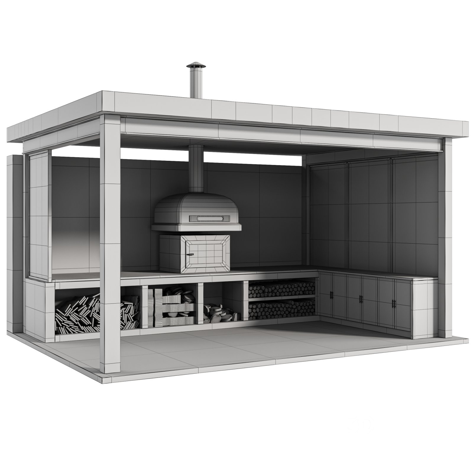 Name: Modern Outdoor Kitchen 03 Tags: outdoor kitchen, modern kitchen, BBQ station, brick wall, garden kitchen, patio oven, open-air cooking, exterior design, summer kitchen, black metal structure, wood storage, built-in oven, modern grill, minimal architecture, outdoor cabinet, terrace design, backyard cooking, 3D model, corona render, loft outdoor |