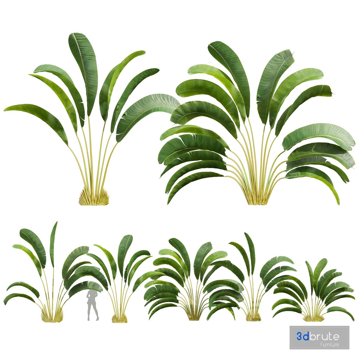 Description: S. nicolai is a massive, evergreen perennial, with oblong, gray-green leaf blades up to 1.5m long on 2m long leaf stalks. In spring it produces blue and white flowers, opening in succession, from blackish, beak-like spathes. 5 Different 3D models in the scene Height: 5300mm & 4700mm & 4500mm & 4800mm & 3400mm Big Preview: 1- Materials is archive (material library) Note: - To use the max file you need to use at 3dsmax 2015 + Blender 2.9 If you have any problems for setting up the models, |