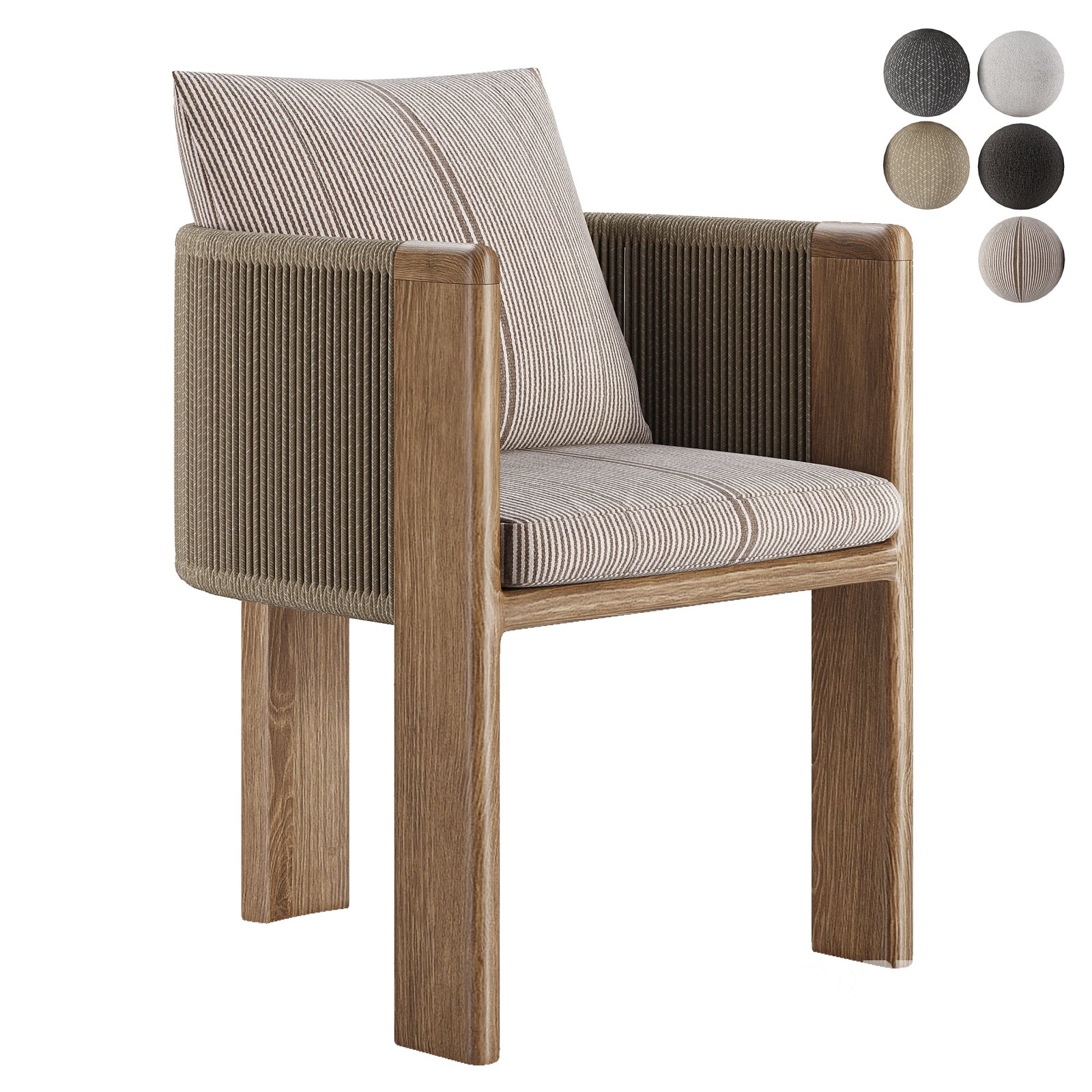 Model:Palm Beach Dining Chair Units: Centimeter OVERALL DIMENSIONS Width: 22"W Depth: 24.4"D Height: 32.7"H -Material Fabric: -Material base: -Material Rope: it is recommended to install a version of at least 1.5, since the glossiness of materials is configured considering PBR Reference: https://shopharbour.com/products/palm-beach-teak-dining-chair |