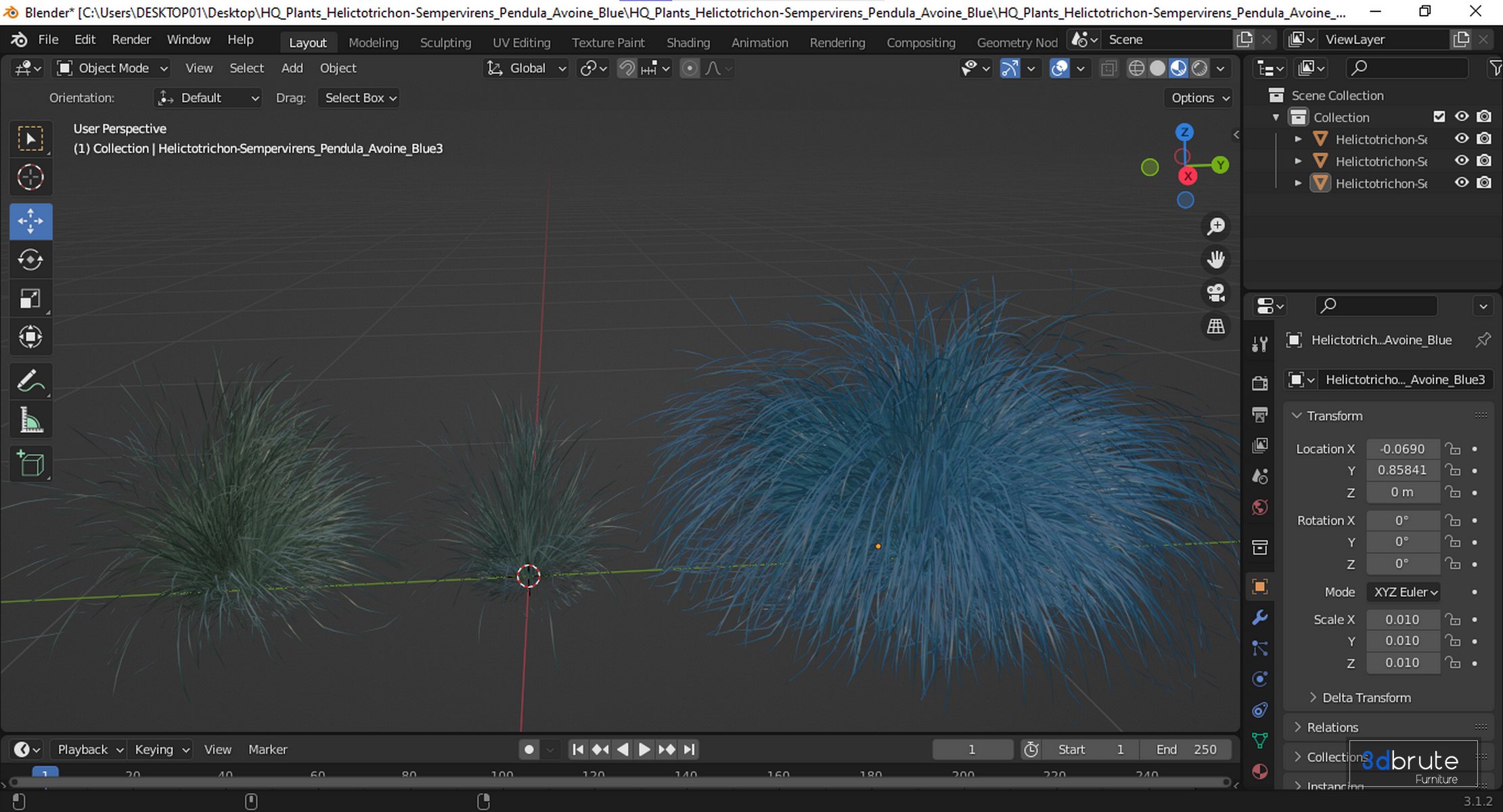 Description: It forms well-demarcated, densely mounded clumps of upright, silvery-blue leaves, reaching up to 75 cm in height. Flowering more profusely than the type species in late spring; the inflorescences protrude more than 60 cm above the foliage, at the hot end, and are distinctly drooping. Flowering is best assured in regions with cool springs and constant humidity, but this plant also deserves to be grown for its leaves alone. 3 Different 3D models in the scene Height: 500mm & 600mm & 700mm 1_ Materials is archive (material library) Note: _ To use the max file you need to use at 3dsmax 2015 |