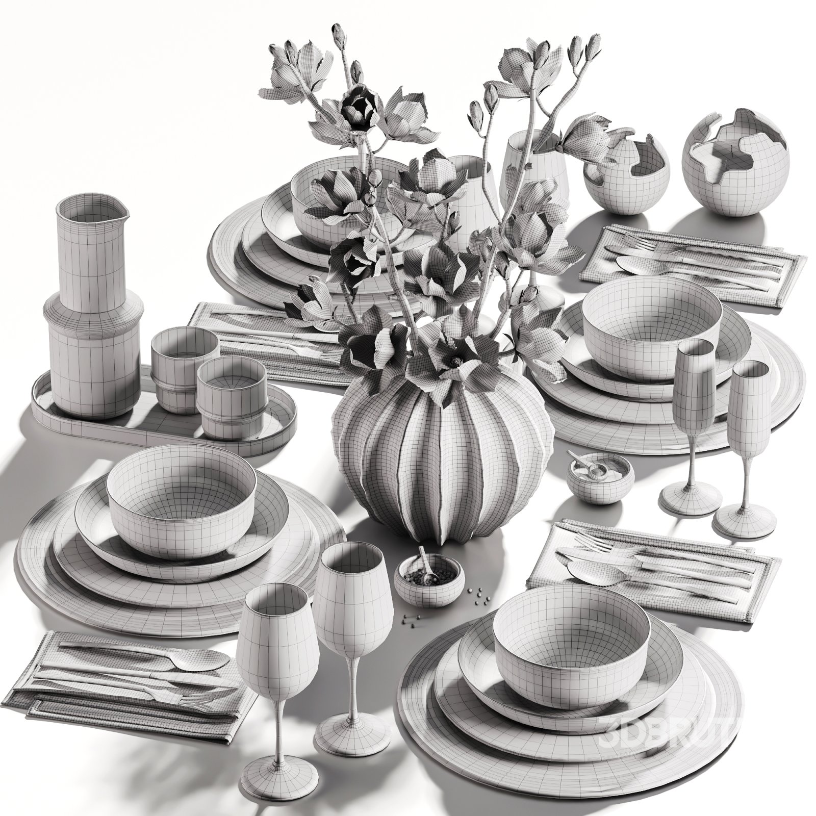 -Realistic Details: Detailed magnolia flowers, sculptural vase, ceramic and metallic bowls, plates, cutlery, and glassware for lifelike rendering.