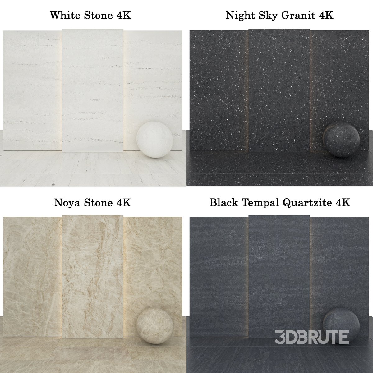 Collection Stone 121 : This collection includes: 10 Texture Beige Noya Stone with Glossiness Maps 6 Texture Black Tempal Quartzite with Glossiness Maps 6 Texture Night Sky Granit with Glossiness Maps 6 texture White Stone with Glossiness Maps Size textures are: 2000p * 4000p no use Plugins |