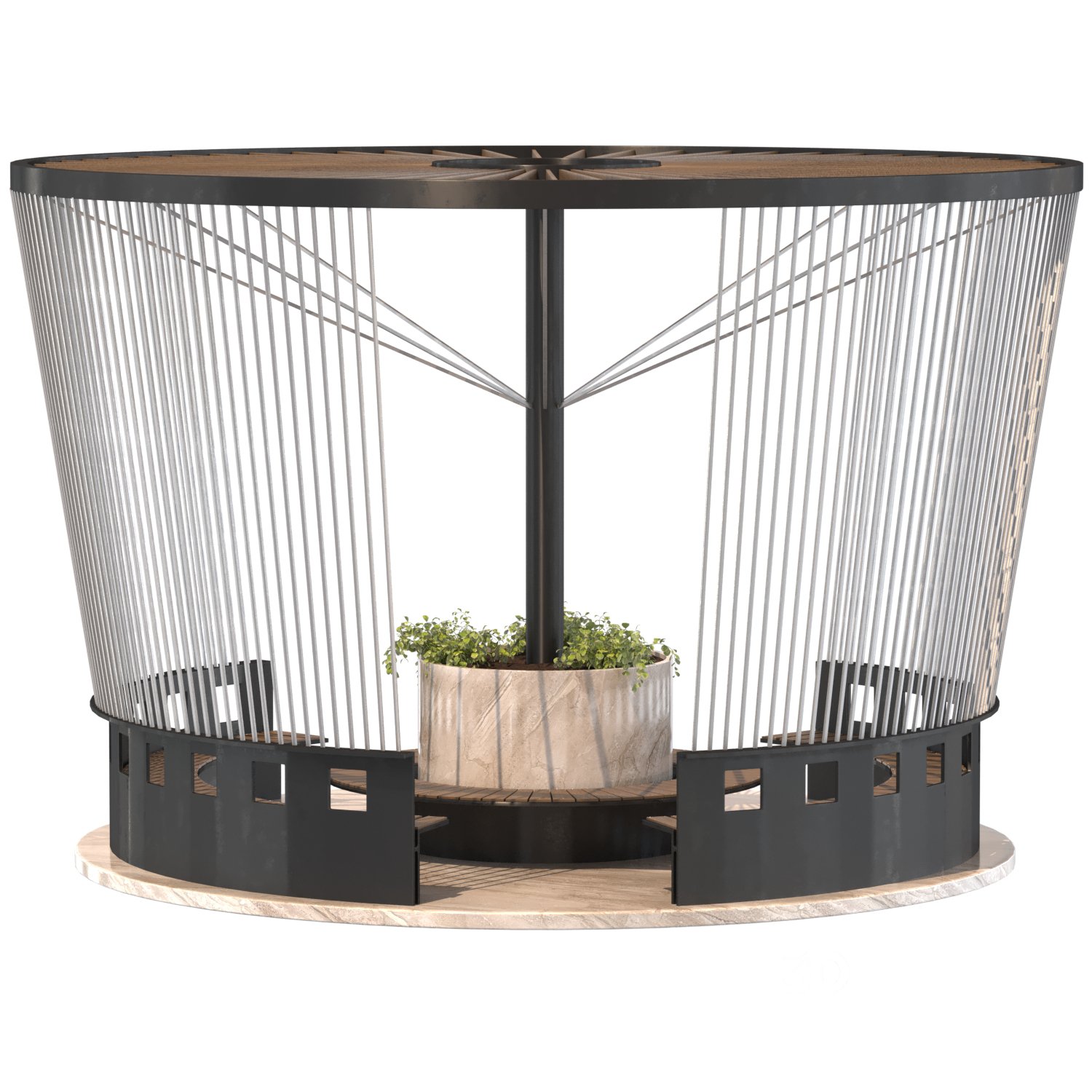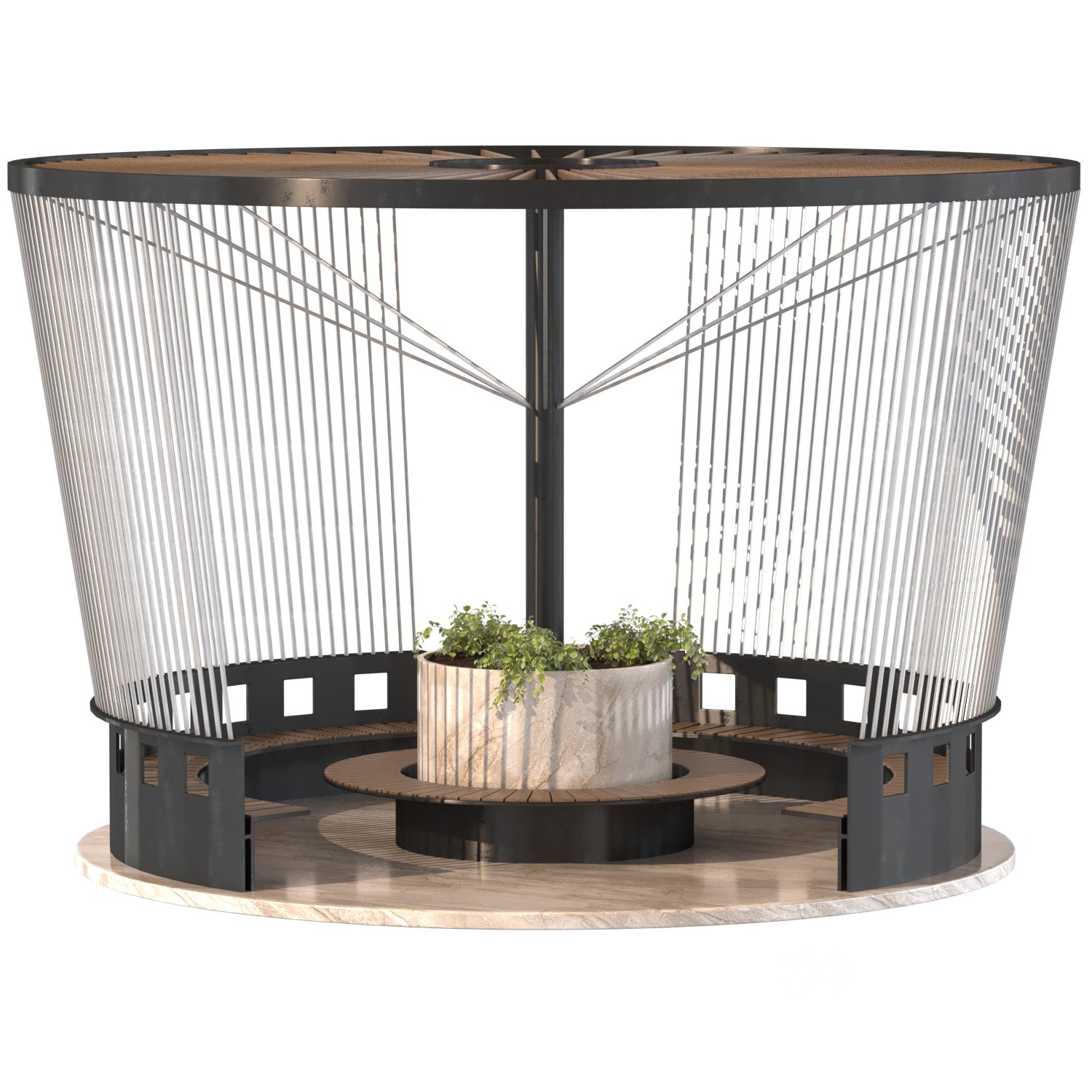 Urban Furniture 06 Modern urban furniture designed for public spaces, featuring a circular bench and integrated planter, enclosed by a visually dynamic metallic frame. Polys: 675,758 | Verts: 702,632 Formats: FBX, OBJ Render Engines: V-Ray 6, Corona 12 Main Materials: Wood, Metal Dimensions: 605×605×398 cm 3ds Max Version: 2018 This elegant urban furniture piece blends architectural aesthetics with functionality. Modeled in 3ds Max 2018 and exported in FBX and OBJ formats, it features a large circular structure with integrated seating around a central planter. The outer shell is defined by upward-sloping metal rods that create a dynamic rhythm and partial enclosure, making it ideal for parks, plazas, or semi-public courtyards. The structure rests on a stone-textured circular base. The seating is crafted from warm-toned wood slats, contrasting with the sleek black metallic support system. A central cylindrical planter made of stone-look material adds greenery to the composition, encouraging social interaction and providing shade or visual relief. This model is optimized for use in architectural visualizations, urban planning presentations, or landscape design projects. It's available with clean geometry and correct UVs, suitable for both V-Ray 6 and Corona 12 renderers. |