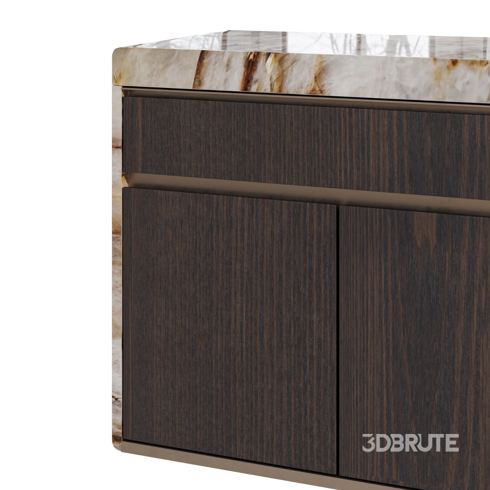 Low cabinet with six doors, featuring boxed marble on the top and sides, and satin steel profiles for door operation. The doors are asymmetrically clad in a mix of matte veneered wood and antique, glossy, or satin metal. Wooden interior includes a glass shelf and matte lacquered or veneered back panel, with optional LED interior lighting. Dimensions polys 123582 https://www.visionnaire-home.com/products/storage-unit/drusilla_760 Made by Dssuthar |
