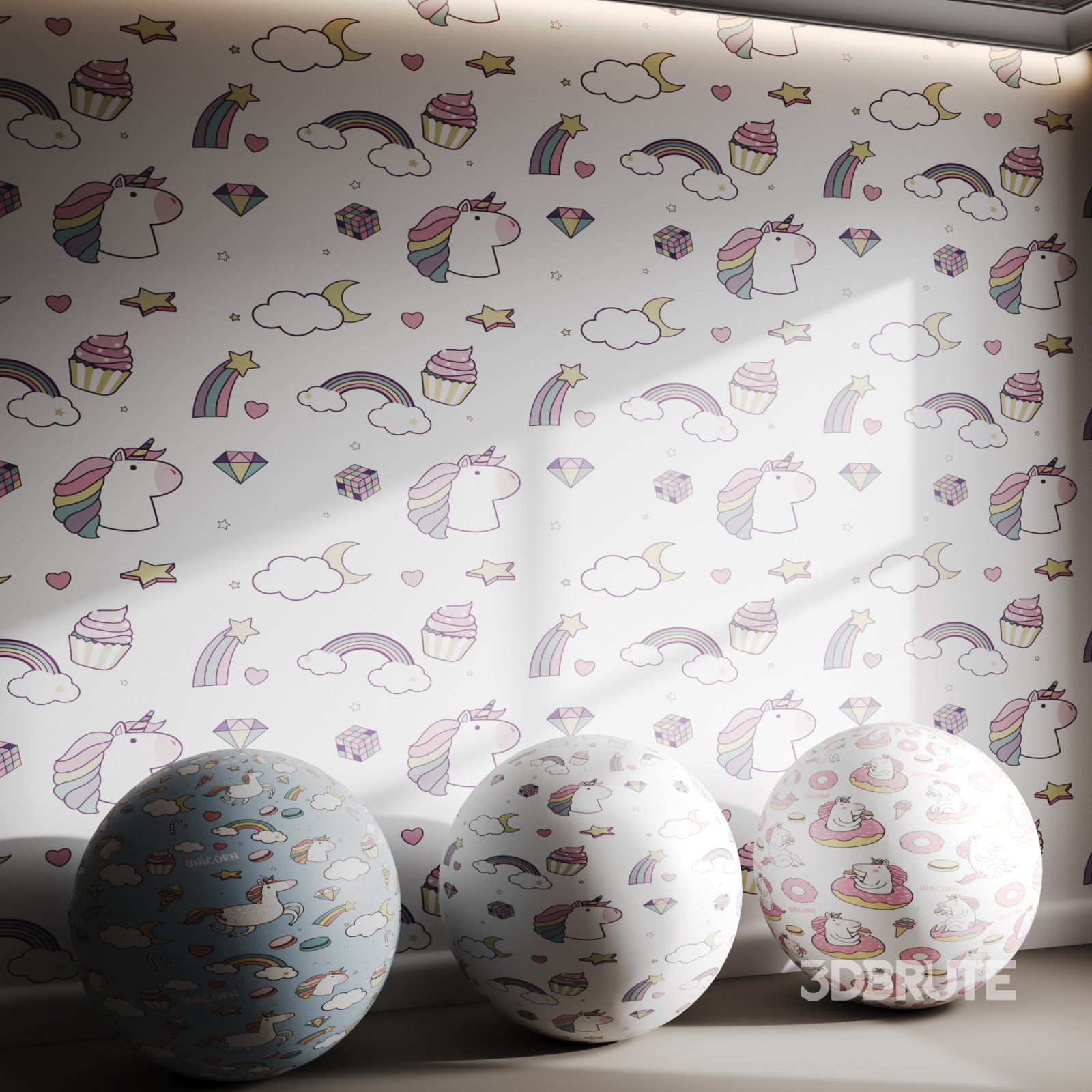 Name: Wallpaper 29 Tags: unicorn, rainbow, pastel, clouds, stars, hearts, cupcakes, kids room, fantasy, cute decor, whimsical, magical, dreamy, ice cream, donuts, macaron, girly wallpaper, cartoon, playful, soft colors |