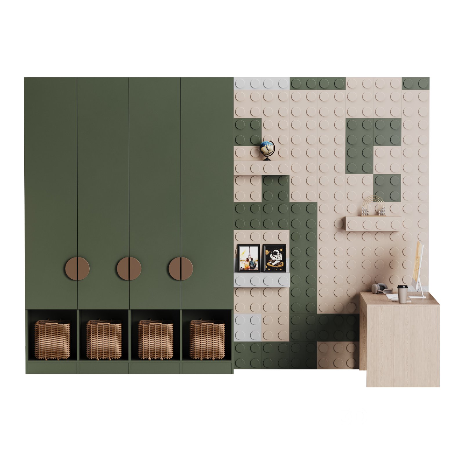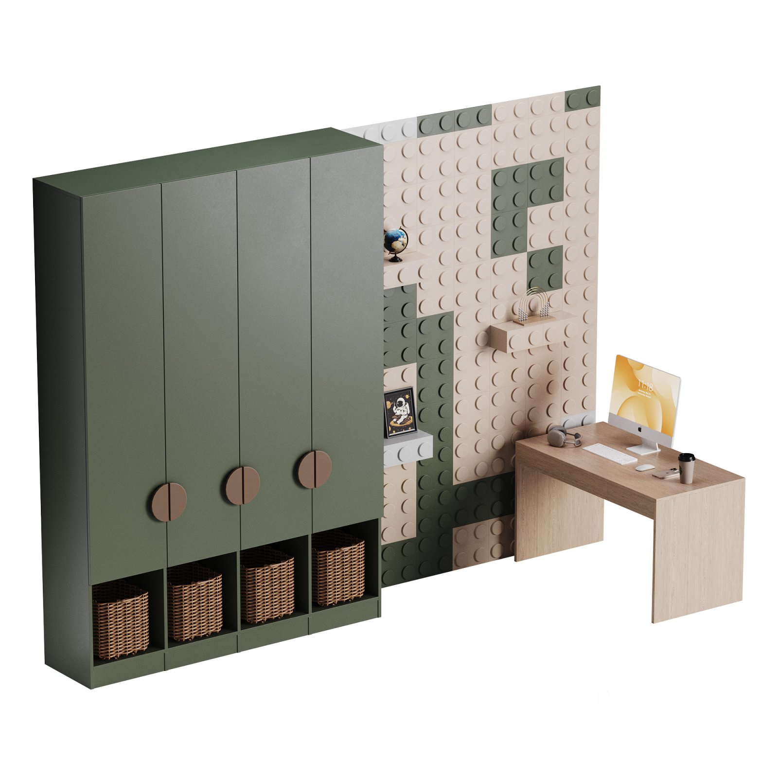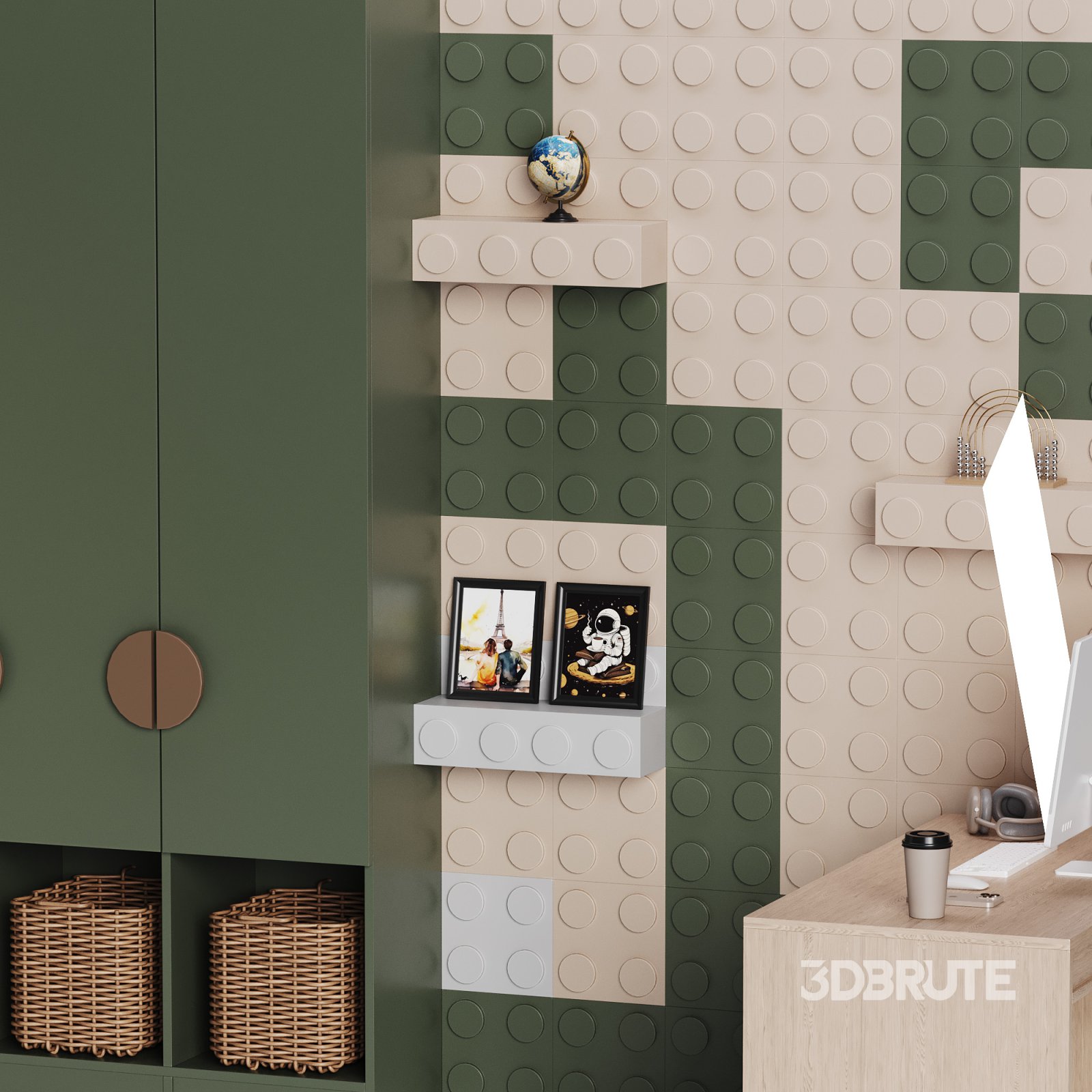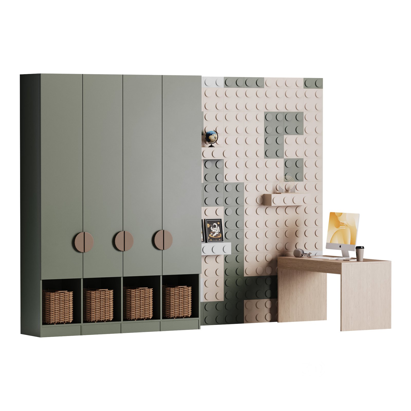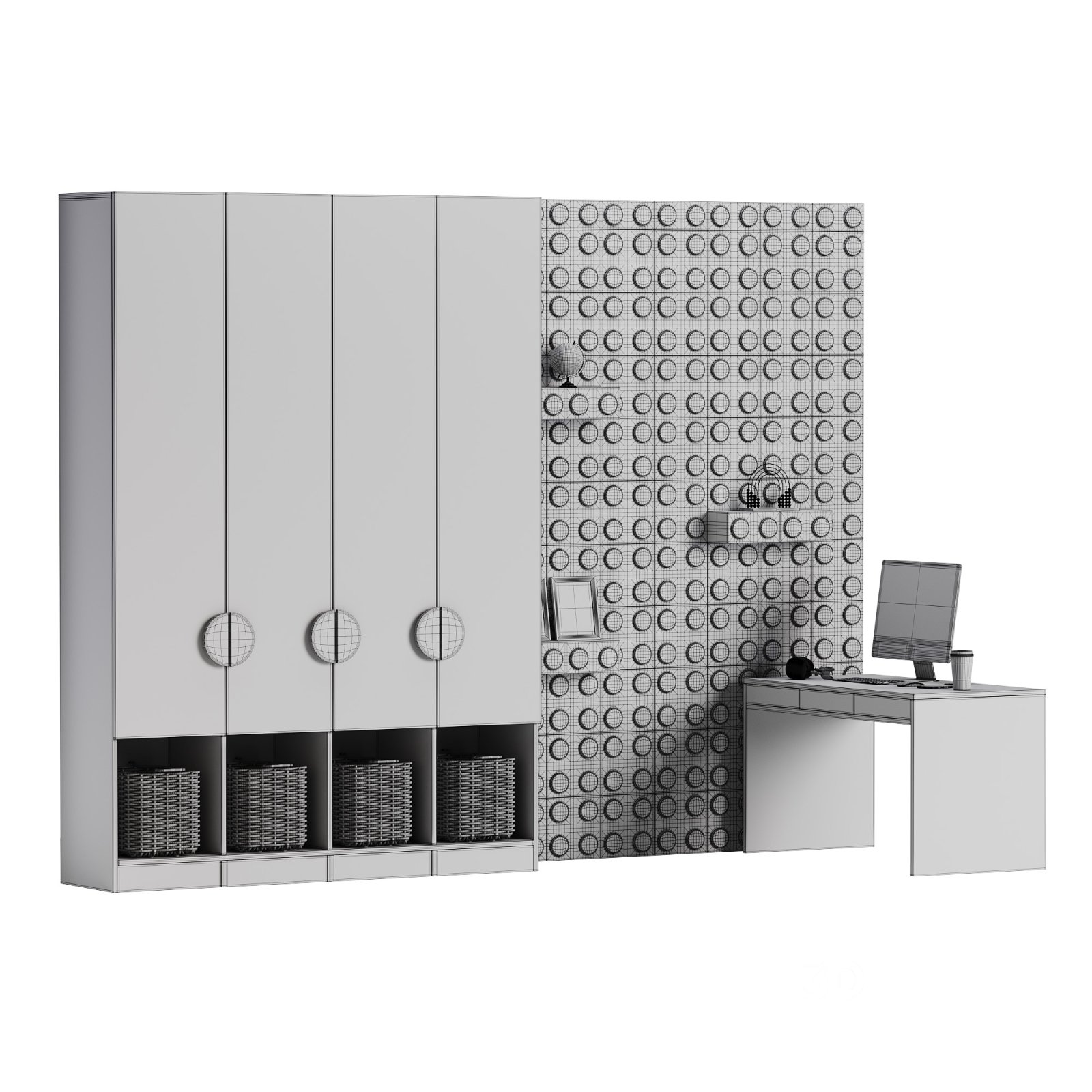 Name: Workplace for Children 26 Description: This 3D model represents a spacious and ergonomic children's workspace, featuring a well-designed desk and a comfortable chair. The layout includes modern elements with ample storage, ideal for a creative and functional study area. Perfect for a children's bedroom or dedicated study room. Tags: 3DModel, Children'sWorkspace, StudyDesk, FurnitureDesign, InteriorDesign, 3DsMax, FBX, OBJ, CoronaRendering, HighPoly |